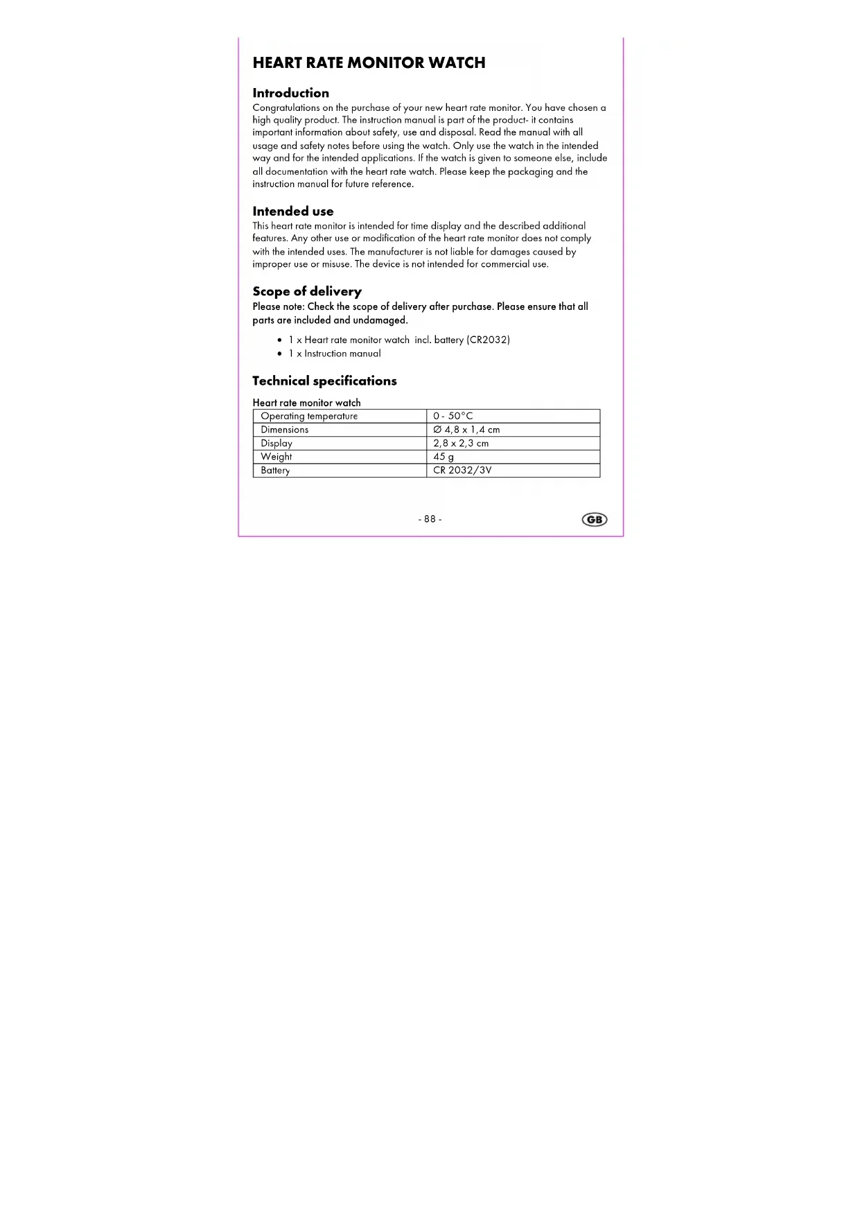 Introduction Congratulations on the purchase of your new heart rate monitor. You have chosen a high quality product. The instruction manual is part of the product- it contains important information about safety, use and disposal. Read the manual with all usage and safety notes before using the watch. Only use the watch in the intended way and for the intended applications. If the watch is given to someone else, include all documentation with the heart rate watch. Please keep the packaging and the instruction manual for future reference. Intended use This heart rate monitor is intended for time display and the described additional features. Any other use or modification of the heart rate monitor does not comply with the intended uses. The manufacturer is not liable for damages caused by improper use or misuse. The device is not intended for commercial use. Scope of delivery Please note: Check the scope of delivery after purchase. Please ensure that all parts are included and undamaged. 1 x Heart rate monitor watch incl. battery (CR2032) 1 x Instruction manual Technical specifications Heart rate monitor watch Operating temperature