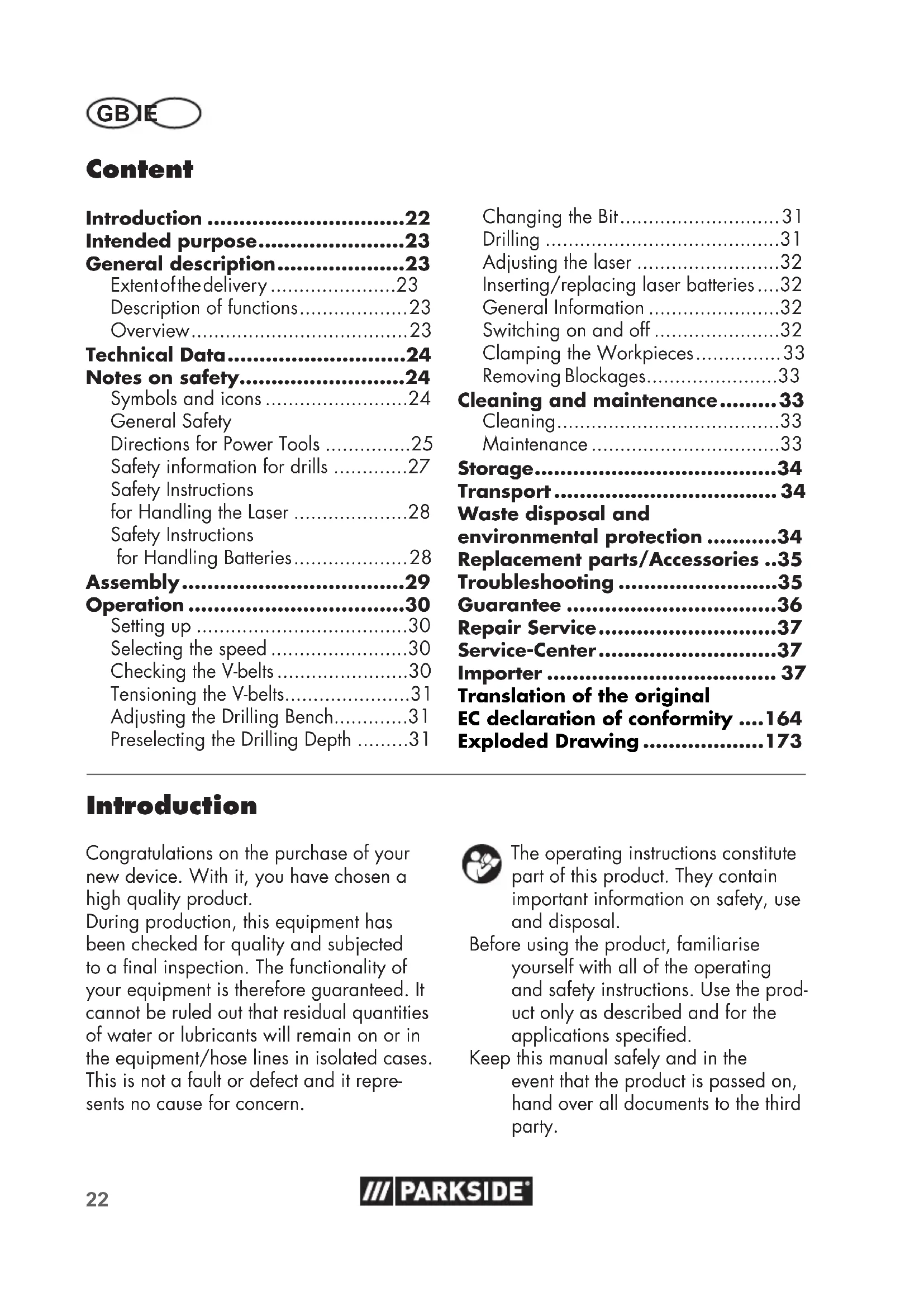 1 Gear cover 2 Holder for drill chuck key and Allen key 3 Locking screw for gear cover 4 Locking nut for motor unit 5 Motor unit 6 Column tube 7 Locking handle 8 3 Assembly screws 9 Baseplate 10 Retaining screw for drilling bench inclination 11 Mounting screws for vice 12 Drilling bench 13 Vice 14 Chuck jaws 15 Angle scaling 16 Clamping screws for motor unit 17 Battery compartment, laser 18 Laser controller 19 Clamping screw for safety device 20 Drill spindle 21 Drill chuck 22 Drill lifting arm 23 Safety device 24 Emergency stop switch 25 Hand spindle guide 26 Cover, emergency stop switch 27 Off switch 28 On switch 29 Depth stop with scale 30 Locking screw of the depth stop24 GB IE 31 Drill chuck key 32 Allen key 33 On/off switch for laser