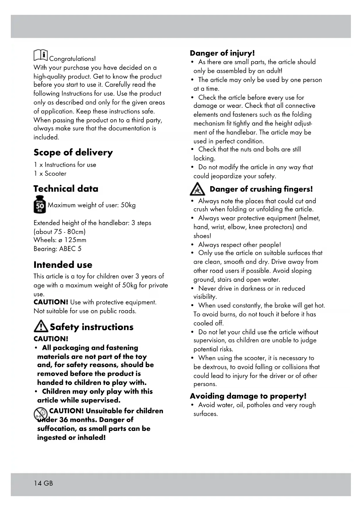 - For braking, step onto the brake plate (14). Maintenance Changing the wheels (Fig. G) Important! Please observe the technical data. Wheels with a different diameter can change the handling characteristics and may lead to danger for the user. Never use wheels that cannot be fitted properly. Never fit larger wheels than the original wheels of the article. The wheels wear. Wear is dependent on many factors, such as the ground, the height and width of the user, the weather conditions, the material of the wheels and their hardness. Therefore, it is necessary to change them from time to time.