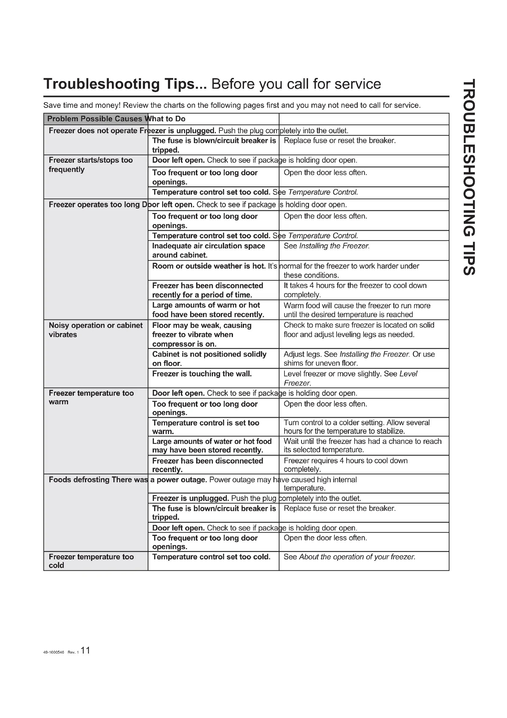 Turn right to lowerTurn left to raise49-1000546 Rev. 1 11 Problem Possible Causes What to Do Freezer does not operate Freezer is unplugged. 3XVKWKHSOXJFRPSOHWHO\LQWRWKHRXWOHW The fuse is blown/circuit breaker is tripped. Replace fuse or reset the breaker. Freezer starts/stops too frequently Door left open. Check to see if package is holding door open. Too frequent or too long door openings. Open the door less often. Temperature control set too cold. See Temperature Control. Freezer operates too long Door left open. Check to see if package is holding door open. Too frequent or too long door openings. Open the door less often. Temperature control set too cold. See Temperature Control. Inadequate air circulation space around cabinet. See Installing the Freezer. Room or outside weather is hot. ,W¶VQRUPDOIRUWKHIUHH]HUWRZRUNKDUGHUXQGHU these conditions. Freezer has been disconnected recently for a period of time. It takes 4 hours for the freezer to cool down FRPSOHWHO\ Large amounts of warm or hot food have been stored recently. :DUPIRRGZLOOFDXVHWKHIUHH]HUWRUXQPRUH XQWLOWKHGHVLUHGWHPSHUDWXUHLVUHDFKHG Noisy operation or cabinet vibrates Floor may be weak, causing freezer to vibrate when compressor is on. &KHFNWRPDNHVXUHIUHH]HULVORFDWHGRQVROLG IORRUDQGDGMXVWOHYHOLQJOHJVDVQHHGHG Cabinet is not positioned solidly on floor. Adjust legs. See Installing the Freezer. Or use VKLPVIRUXQHYHQIORRU Freezer is touching the wall. /HYHOIUHH]HURUPRYHVOLJKWO\6HHLevel Freezer. Freezer temperature too warm Door left open. Check to see if package is holding door open. Too frequent or too long door openings. Open the door less often. Temperature control is set too warm. 7XUQFRQWUROWRDFROGHUVHWWLQJ$OORZVHYHUDO KRXUVIRUWKHWHPSHUDWXUHWRVWDELOL]H Large amounts of water or hot food may have been stored recently. Wait until the freezer has had a chance to reach LWVVHOHFWHGWHPSHUDWXUH Freezer has been disconnected recently. )UHH]HUUHTXLUHVKRXUVWRFRROGRZQ FRPSOHWHO\ Foods defrosting There was a power outage. 3RZHURXWDJHPD\KDYHFDXVHGKLJKLQWHUQDO WHPSHUDWXUH Freezer is unplugged. 3XVKWKHSOXJFRPSOHWHO\LQWRWKHRXWOHW The fuse is blown/circuit breaker is tripped. Replace fuse or reset the breaker. Door left open. Check to see if package is holding door open. Too frequent or too long door openings. Open the door less often. Freezer temperature too cold Temperature control set too cold. See About the operation of your freezer. TROUBLESHOOTING TIPS