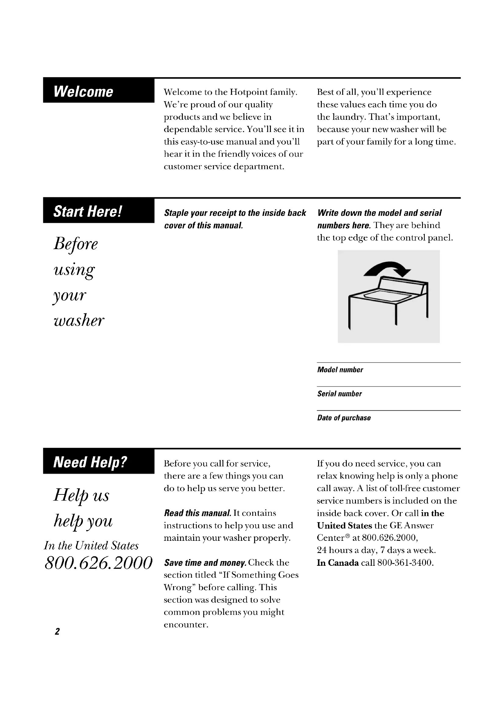If Something Goes Wrong Before You Call For Service Camco Service Numbers Warranty Washer Owner’s Manual Model: VLXR1020T 175D1807P17639-93538-96 CGWelcome to the Hotpoint family.We’re proud of our quality products and we believe in dependable service. You’ll see it inthis easy-to-use manual and you’llhear it in the friendly voices of our customer service department. Best of all, you’ll experience these values each time you do the laundry. That’s important,because your new washer will bepart of your family for a long time. Welcome Staple your receipt to the inside back cover of this manual. Write down the model and serial numbers here. They are behind the top edge of the control panel.Model numberSerial numberDate of purchase Before using your washer Need Help? Before you call for service, there are a few things you can do to help us serve you better. Read this manual. It contains instructions to help you use andmaintain your washer properly. Save time and money. Check the section titled “If Something GoesWrong” before calling. This section was designed to solve common problems you mightencounter.If you do need service, you canrelax knowing help is only a phonecall away. A list of toll-free customerservice numbers is included on theinside back cover. Or call in theUnited States the GE AnswerCenter at 800.626.2000, 24 hours a day, 7 days a week. In Canada call 800-361-3400. Help us help you
