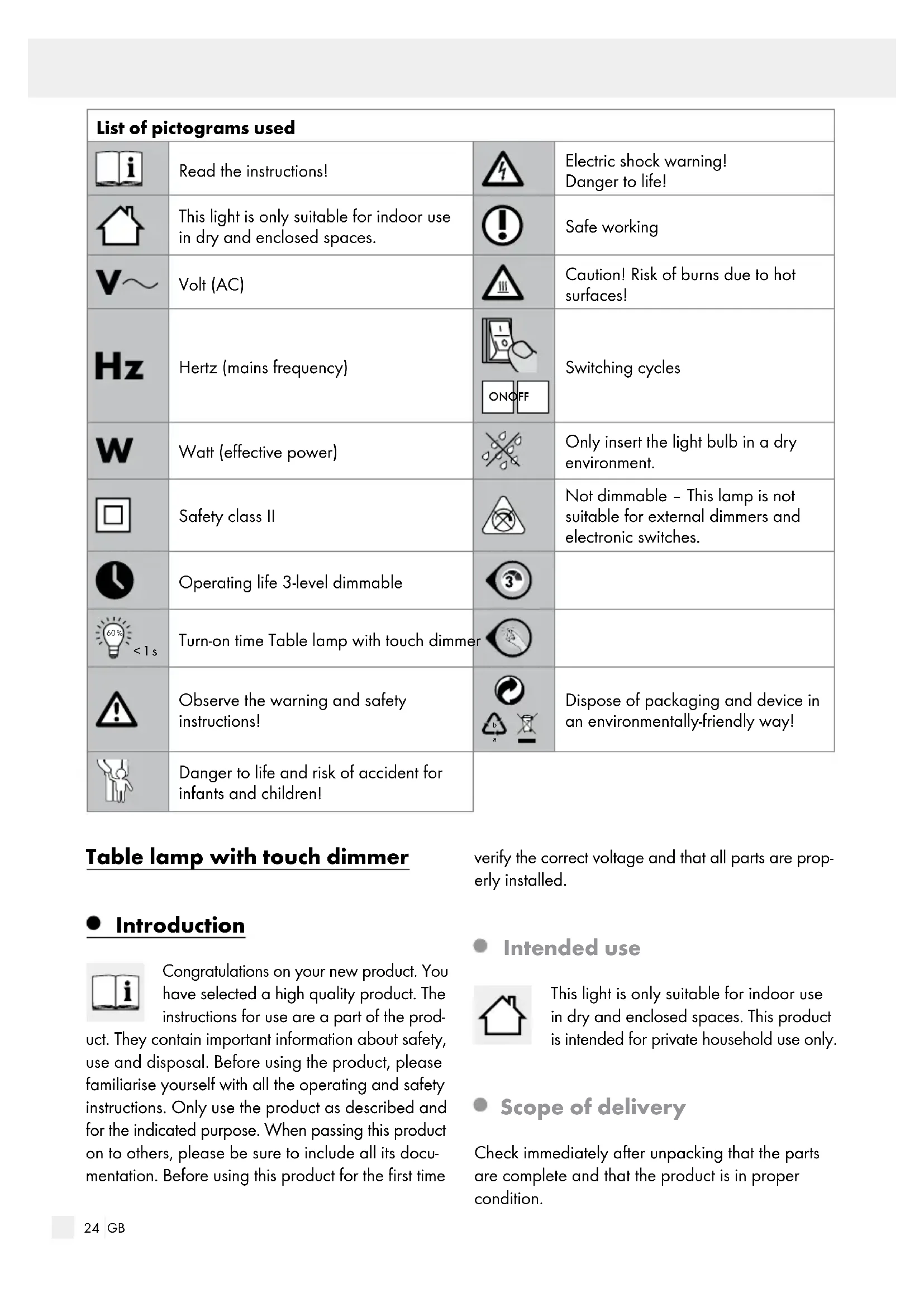 Dispose of packaging and device in an environmentally-friendly way! Danger to life and risk of accident for infants and children! Table lamp with touch dimmer Introduction Congratulations on your new product. You have selected a high quality product. The instructions for use are a part of the prod- uct. They contain important information about safety, use and disposal. Before using the product, please familiarise yourself with all the operating and safety instructions. Only use the product as described and for the indicated purpose. When passing this product on to others, please be sure to include all its docu- mentation. Before using this product for the first time verify the correct voltage and that all parts are prop- erly installed.
