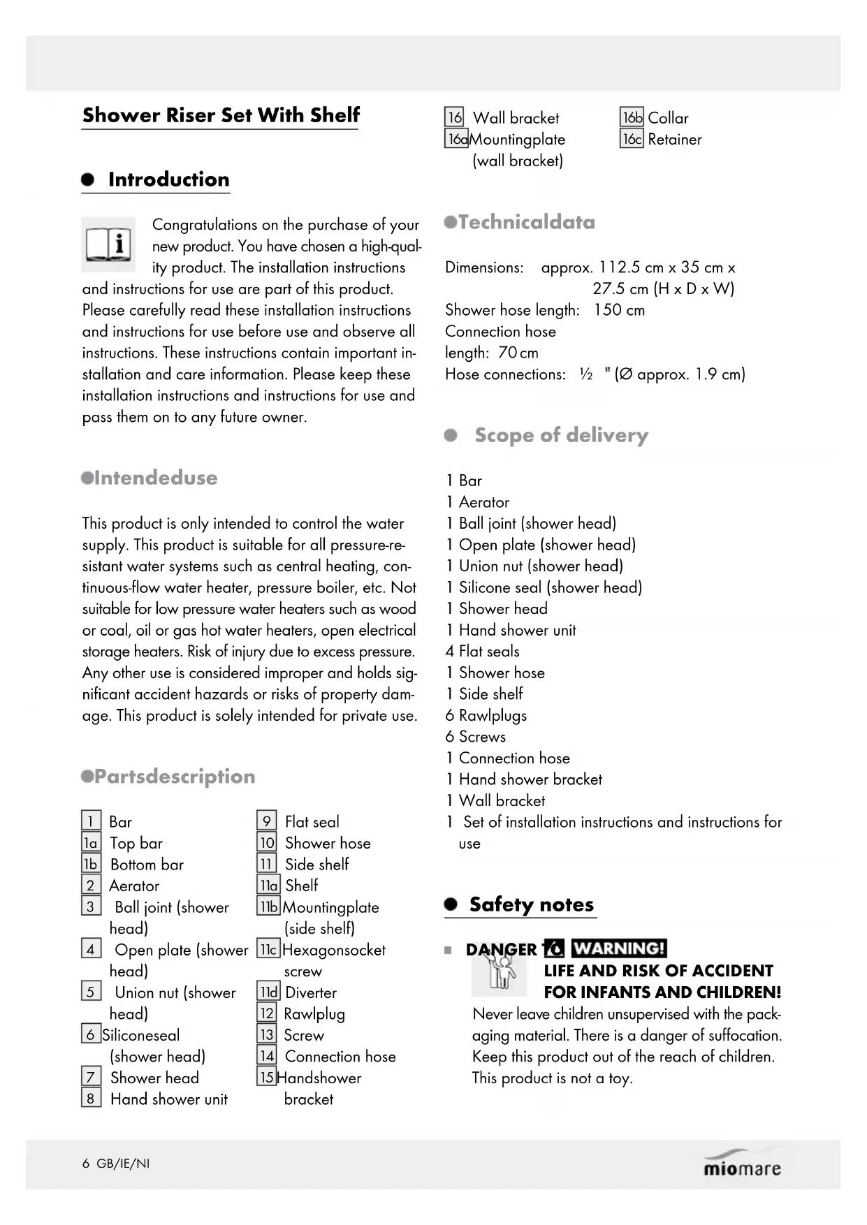 FOR INFANTS AND CHILDREN! Never leave children unsupervised with the pack- aging material. There is a danger of suffocation. Keep this product out of the reach of children. This product is not a toy.7 GB/IE/NI This product may be used by children aged 8 years and up, as well as by persons with reduced physical, sensory or mental capacities or lacking experience and knowledge, so long as they are supervised or instructed in the safe use of the product and understand the associated risks. Do not allow children to play with the product. Cleaning and user maintenance must not be performed by children without supervision. CAUTION! RISK OF INJURY! Make sure that all parts are undamaged and correctly as- sembled. Improper installation may result in in- jury. Damaged parts could impact safety and function. Installation must be performed by skilled persons. RISK OF WATER DAMAGE! Shut off the main water supply prior to installation. Ensure all seals are seated correctly. This product is not suitable for use with low-pressure tanks and open (non-pressurised) electrical storage heaters. Only use the product in rooms with tempera- tures above 0 °C. In case of potential frost, shut off the water supply and drain the product. Careful when adjusting the water temperature: risk of scalding! Incorrectly installed hand shower sets can cause water damage! Please note that the seals are wear parts and must be changed from time to time. Even careful production can result in sharp edges. Therefore proceed with caution during installa- tion. Before attaching the product to the wall, check which mounting materials are suitable for your wall. We have supplied mounting materials suitable for an ordinary solid masonry wall. RISK OF WATER DAMAGE! Before drilling, ensure that there are no water pipes where you intend to drill. RISK OF ELECTRIC SHOCK! Before drilling, ensure that there are no electrical cables where you intend to drill. Installation Note: carefully check all connections for leaks after first use. Note: incorrect installation will void the warranty, particularly with respect to consequential damage! Screw the bottom bar
