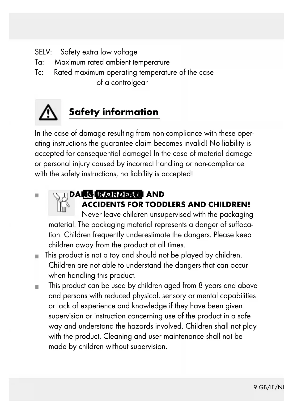 Nominal voltage primary: 220–240 V∼, 50 / 60 Hz Nominal voltage secondary: 30 V , 3.6 W Protection system: IP44 (Splashproof) Protection class: Mains adapter (Model No. S036G300W8D) GS certified.9 GB/IE/NI SELV: Safety extra low voltage Ta: Maximum rated ambient temperature Tc: Rated maximum operating temperature of the case of a controlgear Safety information In the case of damage resulting from non-compliance with these oper- ating instructions the guarantee claim becomes invalid! No liability is accepted for consequential damage! In the case of material damage or personal injury caused by incorrect handling or non-compliance with the safety instructions, no liability is accepted!