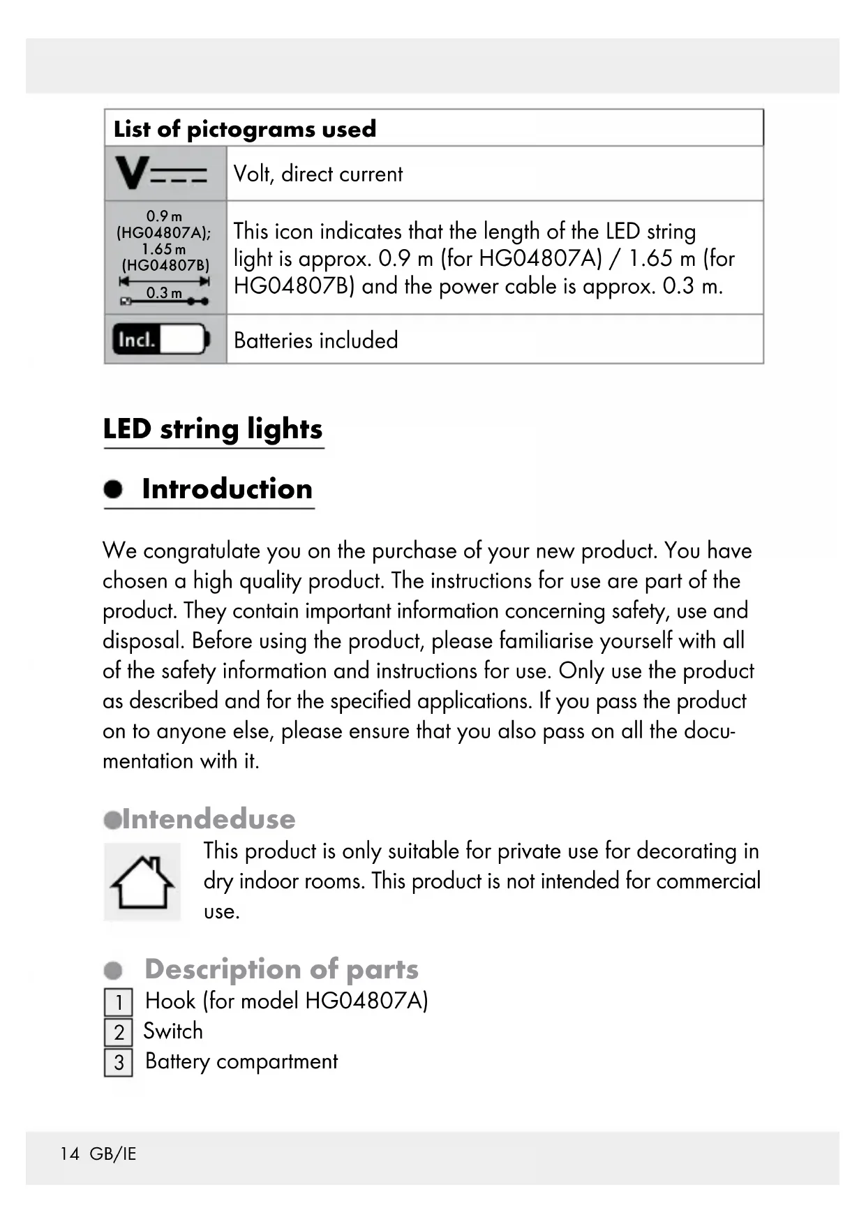 This icon indicates that the length of the LED string light is approx. 0.9 m (for HG04807A) / 1.65 m (for HG04807B) and the power cable is approx. 0.3 m. Batteries included LED string lights Introduction We congratulate you on the purchase of your new product. You have chosen a high quality product. The instructions for use are part of the product. They contain important information concerning safety, use and disposal. Before using the product, please familiarise yourself with all of the safety information and instructions for use. Only use the product as described and for the specified applications. If you pass the product on to anyone else, please ensure that you also pass on all the docu- mentation with it. Intended use This product is only suitable for private use for decorating in dry indoor rooms. This product is not intended for commercial use. Description of parts