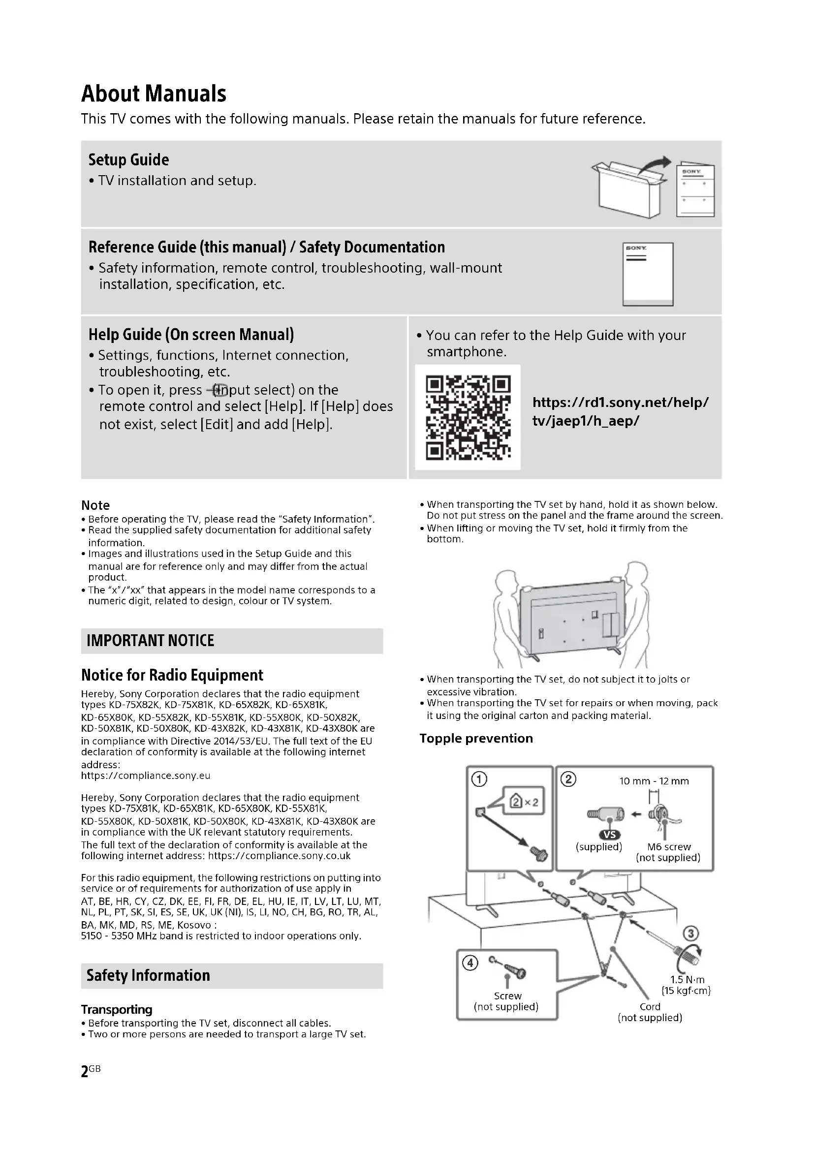 - Before operating the TV, please read the “Safety Information”.• Read the supplied safety documentation for additional safety information. • Images and illustrations used in the Setup Guide and this manual are for reference only and may differ from the actual product.• The “x”/“xx” that appears in the model name corresponds to a numeric digit, related to design, colour or TV system. Notice for Radio Equipment Hereby, Sony Corporation declares that the radio equipment types KD-75X82K, KD-75X81K, KD-65X82K, KD-65X81K, KD-65X80K, KD-55X82K, KD-55X81K, KD-55X80K, KD-50X82K, KD-50X81K, KD-50X80K, KD-43X82K, KD-43X81K, KD-43X80K are in compliance with Directive 2014/53/EU. The full text of the EU declaration of conformity is available at the following internet address: https://compliance.sony.euHereby, Sony Corporation declares that the radio equipment types KD-75X81K, KD-65X81K, KD-65X80K, KD-55X81K, KD-55X80K, KD-50X81K, KD-50X80K, KD-43X81K, KD-43X80K are in compliance with the UK relevant statutory requirements.The full text of the declaration of conformity is available at the following internet address: https://compliance.sony.co.ukFor this radio equipment, the following restrictions on putting into service or of requirements for authorization of use apply in AT, BE, HR, CY, CZ, DK, EE, FI, FR, DE, EL, HU, IE, IT, LV, LT, LU, MT, NL, PL, PT, SK, SI, ES, SE, UK, UK (NI), IS, LI, NO, CH, BG, RO, TR, AL, BA, MK, MD, RS, ME, Kosovo :5150 - 5350 MHz band is restricted to indoor operations only. Transporting