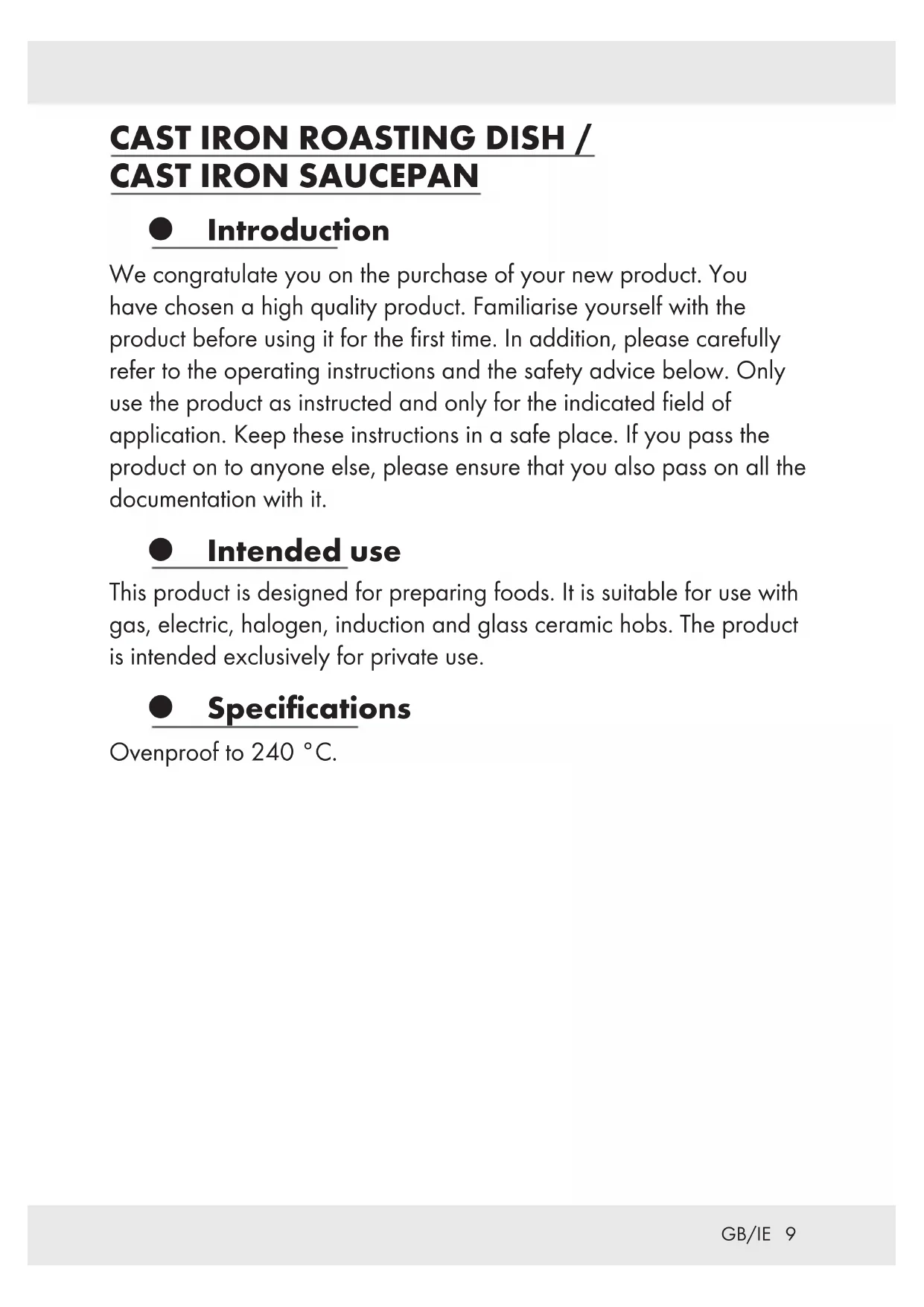 Introduction We congratulate you on the purchase of your new product. You have chosen a high quality product. Familiarise yourself with the product before using it for the first time. In addition, please carefully refer to the operating instructions and the safety advice below. Only use the product as instructed and only for the indicated field of application. Keep these instructions in a safe place. If you pass the product on to anyone else, please ensure that you also pass on all the documentation with it. Intended use This product is designed for preparing foods. It is suitable for use with gas, electric, halogen, induction and glass ceramic hobs. The product is intended exclusively for private use. Specifications Ovenproof to 240 °C.10 GB/IE Safety instructions SAVE ALL SAFETY INSTRUCTIONS AND INSTRUCTIONS FOR USE FOR FUTURE REFERENCE! Beware that the handles may become very hot during cooking. Use oven mitts or BBQ gloves for your protection. Place the product, when hot, on a heatproof base. Do not place the product on an unprotected countertop. During cooking it is extremely important not to lose sight of the product while you are heating grease in it. Grease can overheat very quickly and ignite. In case of a grease fire, never attempt to extinguish the fire with water! Smother the flames with a lid or a thick wool blanket. Never heat up the product while it is empty. Failure to do so may cause the enamel coating to crack. To avoid damage to the enamel coating, use kitchen utensils made of heat-resistant plastic or wood only. Do not cut any food directly in the product. Never put dripping wet meats in hot grease. The resulting splashing grease may come into contact with a glowing hob and start a fire. ATTENTION! Always lift the product when cooking in the oven or on stoves with a glass surface (e.g. glass ceramic, halogen and induction hobs). NEVER slide the product on surfaces such as these, as this may cause damage to the bottom of the product, the hob or the oven. Always adjust the size of gas flames to the bottom of the product — gas flames should NEVER burn past the product's sides.11 GB/IE The product is not microwave proof. The product is ovenproof! Place the product on an oven grate, not directly on the floor of the oven. The product is not dishwasher proof. Do not use the lid if its handle becomes loose. Retighten the lid when necessary. FOOD-SAFE! The flavour and aroma of your foods are not affected by this product. Use Before first use, boil out the product 2 to 3 times with water to remove any production residue. Then clean the product with warm soapy water, rinse with clear water and dry thoroughly. Brush a little oil or butter on the inside of the product. Slowly warm up the product at low temperature. Turn down the temperature as soon as the grease soaks in. Wait approx. 2 to 3 minutes until the product has cooled down and remove any excess grease. Do not cook or roast at high temperature. Cast iron is an excellent retainer of heat, so medium temperature is fully sufficient. Too high a temperature may lead to unsatisfactory cooking results or cause foods to stick, e.g. as with omelet. Do not heat up the product too quickly. Failure to do so may cause the enamel coating to crack, if the cast iron expands more quickly than the enamel.12 GB/IE Notes: The light enamel on the inside of the product is specially designed for slowly preparing food at low temperature or at medium oven temperature. The nubs on the bottom of the lid cause circulation inside the dish during cooking. Rising steam condenses on the lid and is distributed evenly to the food you are preparing via the nubs. This means that your food stays juicy during cooking and thus retains its natural flavour. The enamel surface is not suitable for dry cooking. Always use a little butter or cooking oil and make sure that the bottom of the product is fully covered before heating the dish. Information for use with induction hobs Select a hob size that corresponds to the size of the bottom of the product to prevent heat loss. Effective bottom size approx. 160 mm (314948 – oval pot) Effective bottom size approx. 150 mm (314949 – round pot) Effective bottom size approx. 126 mm (315931 – saucepan) Note: Under certain circumstances, the electromagnetic properties of the hob and the product may cause an odour to occur. This is normal and is not indicative of damage to your induction hob or the cooking dish. Place the product in the middle of the induction hob. CAUTION! High heating rate! When preheating the cooking dish, be careful not to overheat it. In case of overheating, air the room thoroughly.13 GB/IE Cleaning and care Always allow the product to cool down slightly before cleaning. Never submerge the product in cold water while it is still hot. The temperature shock may damage the enamel. Also, do not fill the product with cold water. Rinse your product with hot water and off-the-shelf detergent. First, soak any food residue and remove them using a wooden scraper, sponge or brush. Never use any hard objects, steel wool and / or abrasive or aggressive cleaning agents such as chlorine bleach — failure to do so may damage the enamel. Thoroughly dry the product after cleaning. From time to time, rub a little cooking oil into the rim of the product to prevent the eventual formation of rust bloom. Store the product in a dry, well-ventilated space. CAUTION! Please note that the enamel may be damaged if you drop or strike the product. Disposal The packaging is made entirely of recyclable materials, which you may dispose of at local recycling facilities. Contact your local refuse disposal authority for more details of how to dispose of your worn-out product.14 GB/IE Warranty The product has been manufactured to strict quality guidelines and meticulously examined before delivery. In the event of product defects you have legal rights against the retailer of this product. Your legal rights are not limited in any way b