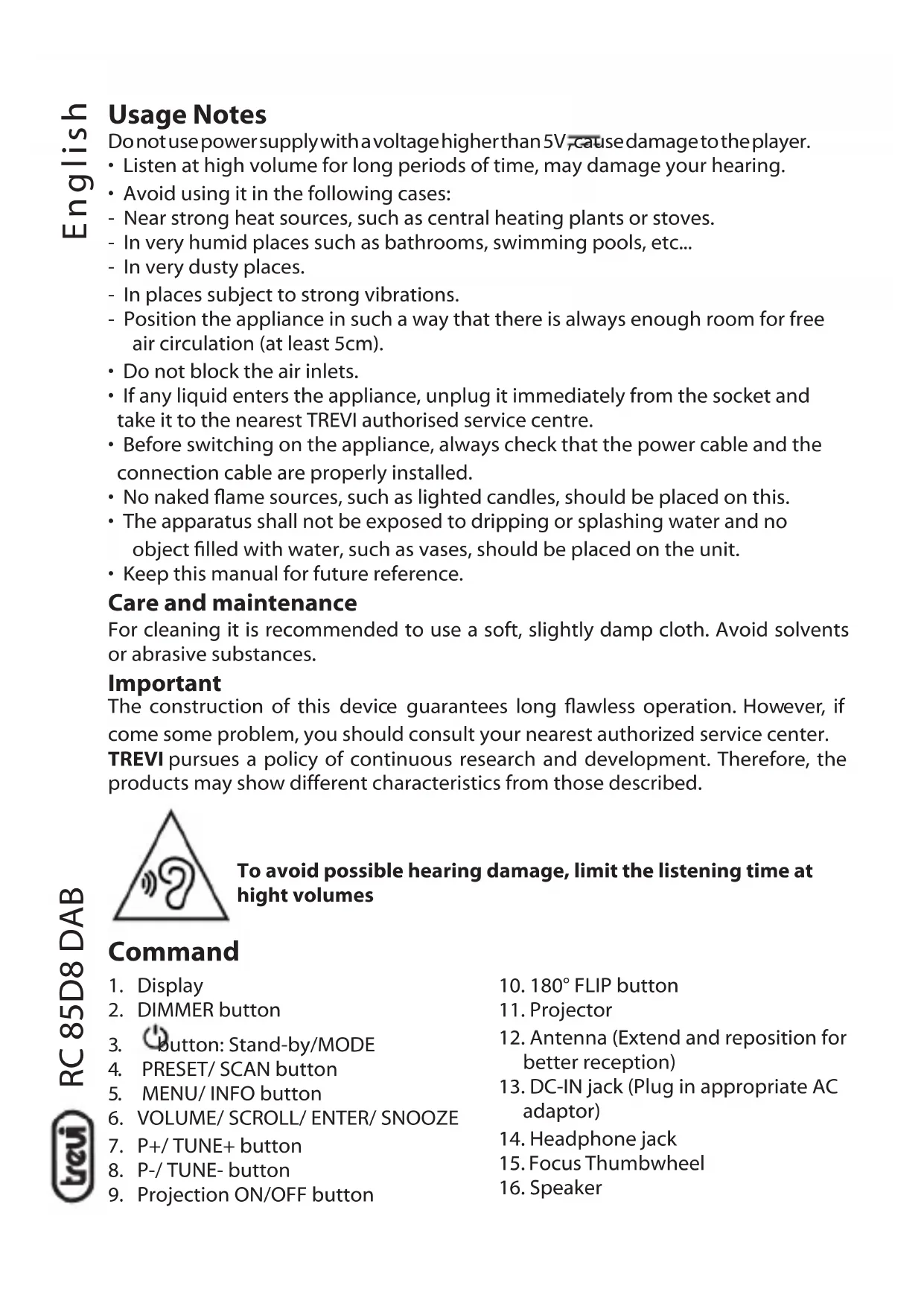 To avoid possible hearing damage, limit the listening time at hight volumes CommandRC 85D8 DAB English Installation Insert the plug of the supplied power adapter into the power supply socket (13) and connect the power supply to a 110-230V ~ 50/60Hz power socket. OPERATION Power On/ Standby: