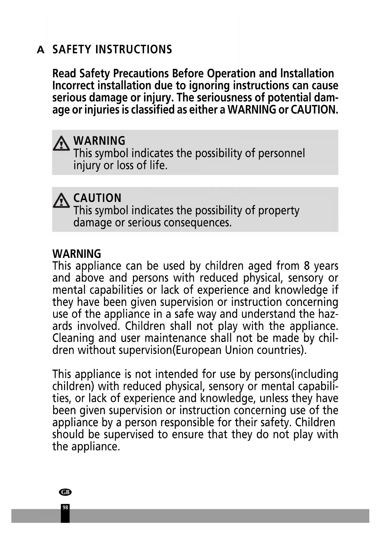 SAFETY INSTRUCTIONS Read Safety Precautions Before Operation and lnstallation Incorrect installation due to ignoring instructions can cause serious damage or injury. The seriousness of potential dam- age or injuries is classified as either a WARNING or CAUTION. WARNING This symbol indicates the possibility of personnel injury or loss of life. CAUTION This symbol indicates the possibility of property damage or serious consequences. WARNING This appliance can be used by children aged from 8 years and above and persons with reduced physical, sensory or mental capabilities or lack of experience and knowledge if they have been given supervision or instruction concerning use of the appliance in a safe way and understand the haz- ards involved. Children shall not play with the appliance. Cleaning and user maintenance shall not be made by chil- dren without supervision(European Union countries). This appliance is not intended for use by persons(including children) with reduced physical, sensory or mental capabili- ties, or lack of experience and knowledge, unless they have been given supervision or instruction concerning use of the appliance by a person responsible for their safety. Children should be supervised to ensure that they do not play with the appliance.