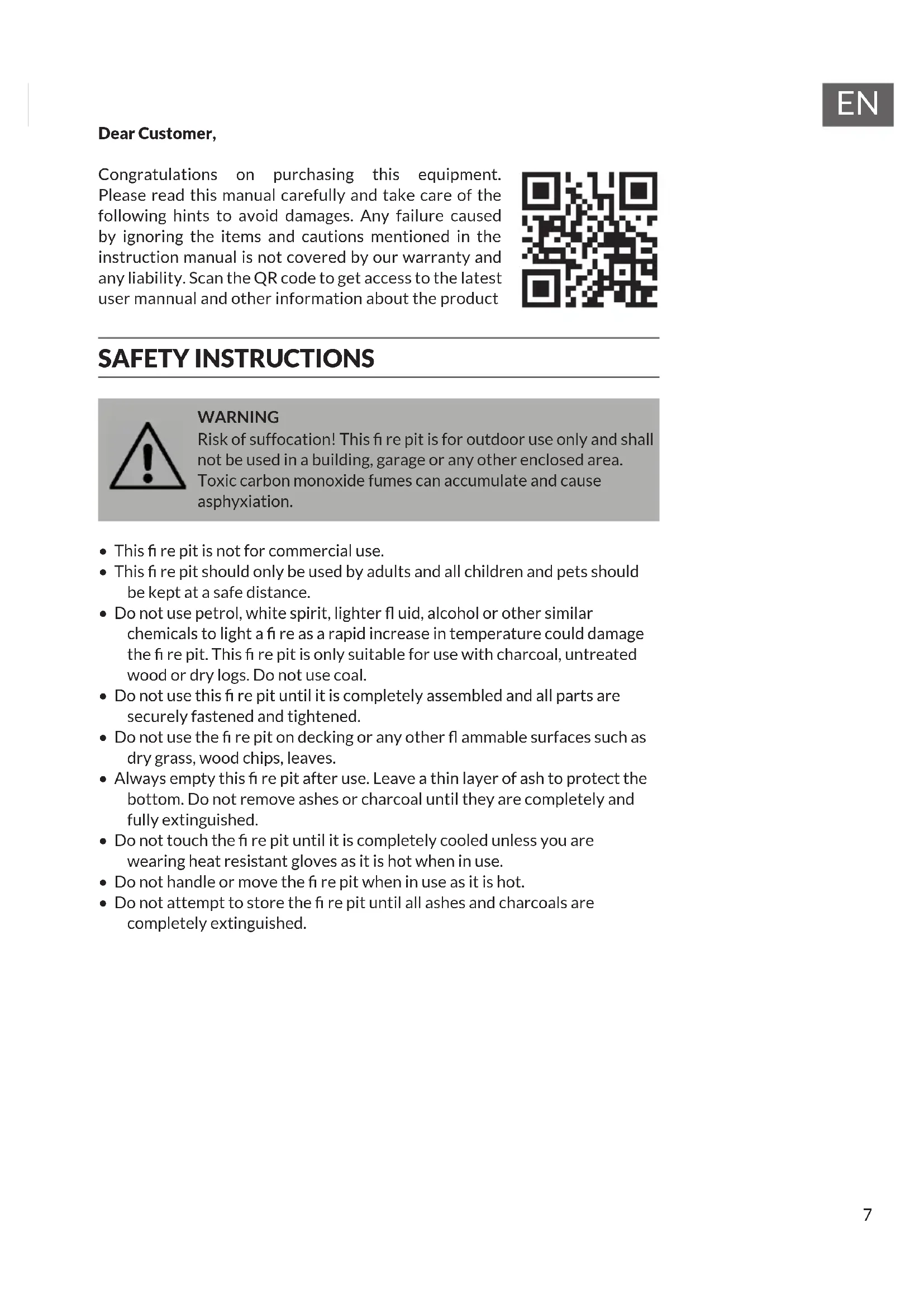 Dear Customer, Congratulations on purchasing this equipment. Please read this manual carefully and take care of the following hints to avoid damages. Any failure caused by ignoring the items and cautions mentioned in the instruction manual is not covered by our warranty and any liability. Scan the QR code to get access to the latest user mannual and other information about the product SAFETY INSTRUCTIONS WARNING Risk of suffocation! This re pit is for outdoor use only and shall not be used in a building, garage or any other enclosed area. Toxic carbon monoxide fumes can accumulate and cause asphyxiation.