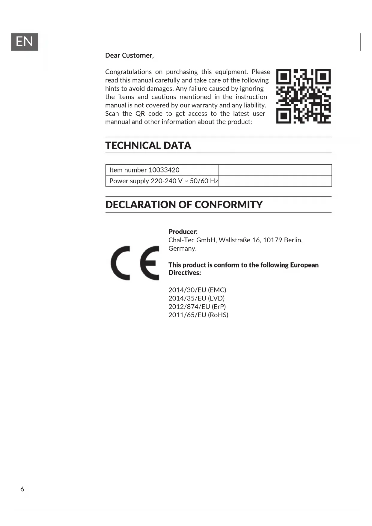 Dear Customer, Congratulaons on purchasing this equipment. Please read this manual carefully and take care of the following hints to avoid damages. Any failure caused by ignoring the items and cauons menoned in the instrucon manual is not covered by our warranty and any liability. Scan the QR code to get access to the latest user mannual and other informaon about the product: TECHNICAL DATA Item number 10033420 Power supply 220-240 V ~ 50/60 Hz