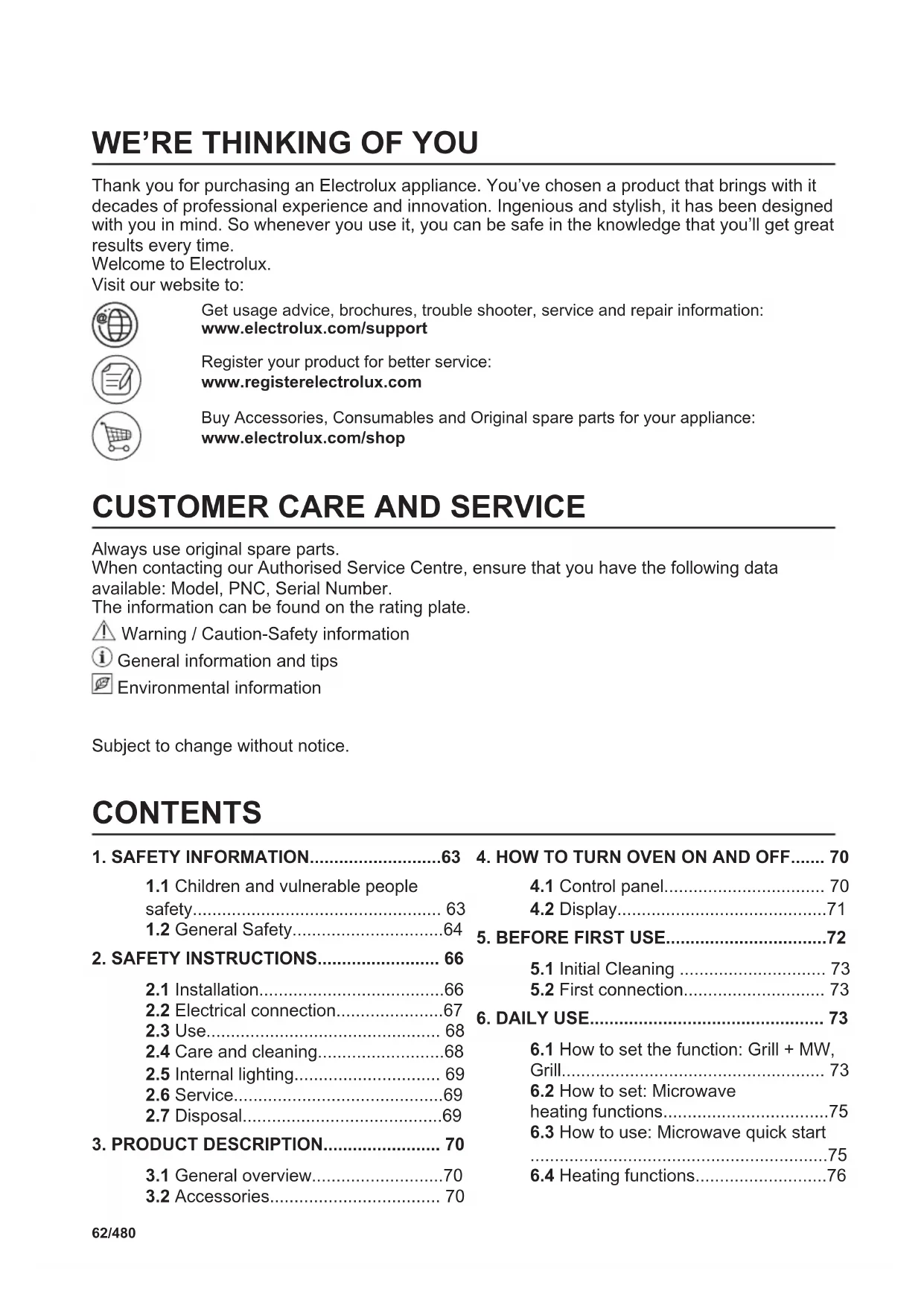 Always use original spare parts. When contacting our Authorised Service Centre, ensure that you have the following data available: Model, PNC, Serial Number. The information can be found on the rating plate. Warning / Caution-Safety information General information and tips Environmental information Subject to change without notice. CONTENTS