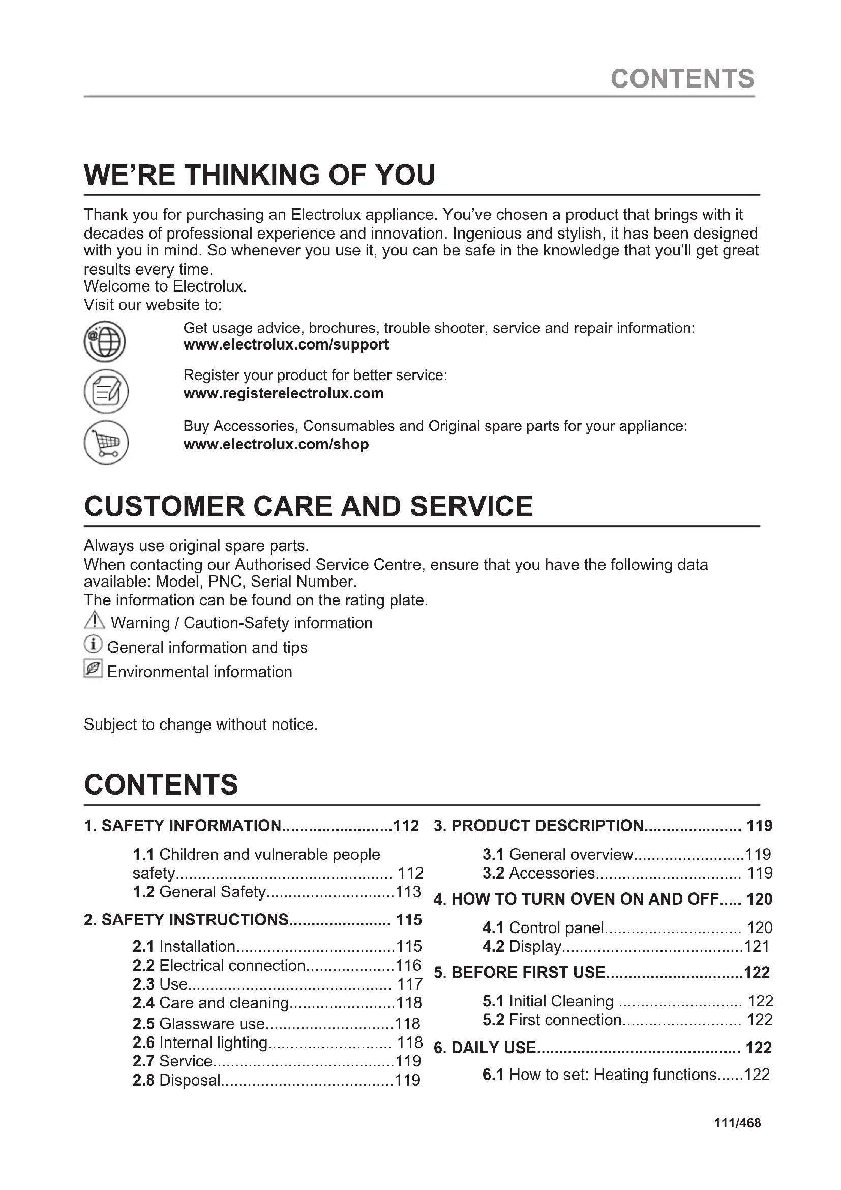 Always use original spare parts. When contacting our Authorised Service Centre, ensure that you have the following data available: Model, PNC, Serial Number. The information can be found on the rating plate. Warning / Caution-Safety information General information and tips Environmental information Subject to change without notice. CONTENTS