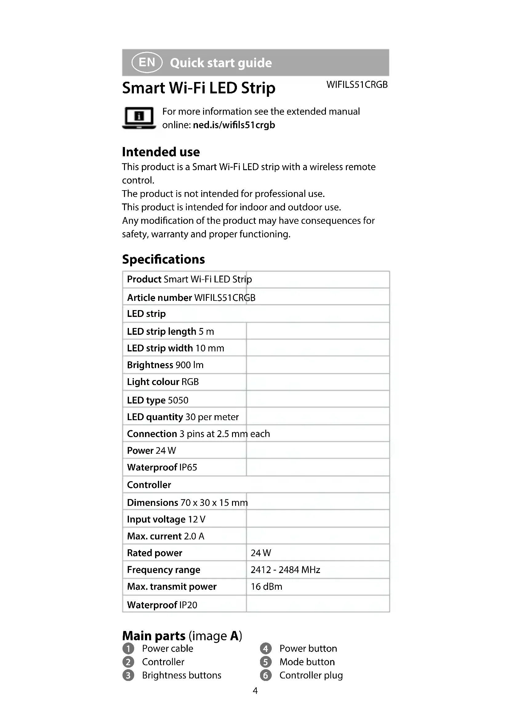Quick start guide Smart Wi-Fi LED Strip WIFILS51CRGB For more information see the extended manual online: ned.is/wils51crgb Intended use This product is a Smart Wi-Fi LED strip with a wireless remote control. The product is not intended for professional use. This product is intended for indoor and outdoor use. Any modication of the product may have consequences for safety, warranty and proper functioning. Specications Product Smart Wi-Fi LED Strip Article number WIFILS51CRGB LED strip LED strip length 5 m LED strip width 10 mm Brightness 900 lm Light colour RGB LED type 5050 LED quantity 30 per meter Connection 3 pins at 2.5 mm each Power 24 W Waterproof IP65 Controller Dimensions 70 x 30 x 15 mm Input voltage 12 V Max. current 2.0 A Rated power 24 W Frequency range 2412 - 2484 MHz Max. transmit power 16 dBm Waterproof IP20 Main parts (image A) 1 Power cable 2 Controller 3 Brightness buttons 4 Power button 5 Mode button 6 Controller plug5 7 IR receiver 8 LED strip 9 IR remote q Music mode w Speed buttons e Colour buttons r Start/stop moving pattern Safety instructions