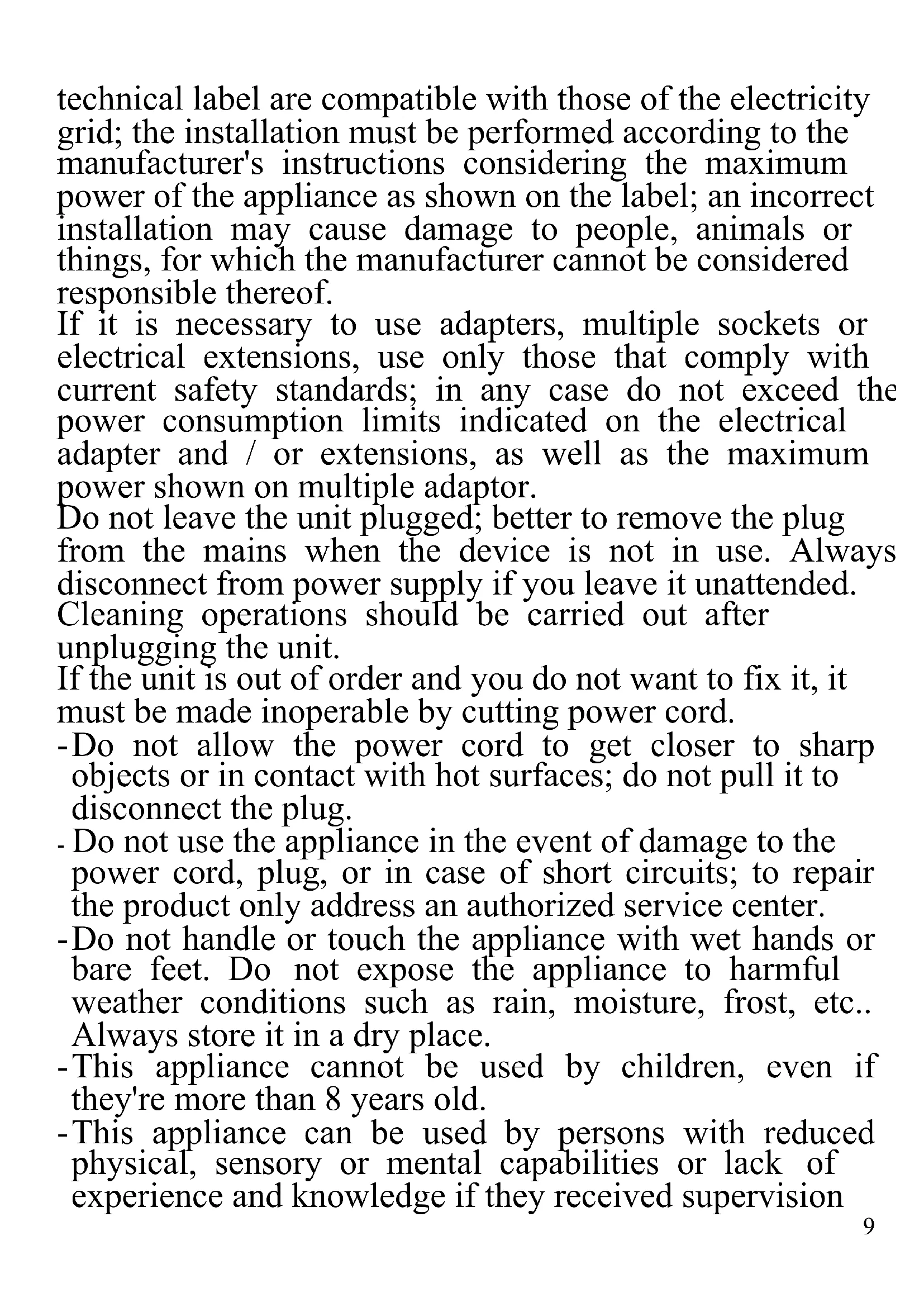 The following are important notes on the installation, use and maintenance; save this instruction manual for future reference; use the equipment only as specified in this guide; any other use is considered improper and dangerous; therefore, the manufacturer cannot be held responsible in the event of damages caused by improper, incorrect or unreasonable use. Before use, ensure the equipment is undamaged; if in doubt, do not attempt to use it and contact the authorized service center; do not leave packing materials (i.e. plastic bags, polystyrene foam, nails, staples, etc.) within the reach of children as they are potential sources of danger; always remember that they must be separately collected. Make sure that the rating information given on the9 technical label are compatible with those of the electricity grid; the installation must be performed according to the manufacturer's instructions considering the maximum power of the appliance as shown on the label; an incorrect installation may cause damage to people, animals or things, for which the manufacturer cannot be considered responsible thereof. If it is necessary to use adapters, multiple sockets or electrical extensions, use only those that comply with current safety standards; in any case do not exceed the power consumption limits indicated on the electrical adapter and / or extensions, as well as the maximum power shown on multiple adaptor. Do not leave the unit plugged; better to remove the plug from the mains when the device is not in use. Always disconnect from power supply if you leave it unattended. Cleaning operations should be carried out after unplugging the unit. If the unit is out of order and you do not want to fix it, it must be made inoperable by cutting power cord. - Do not allow the power cord to get closer to sharp objects or in contact with hot surfaces; do not pull it to disconnect the plug. - Do not use the appliance in the event of damage to the power cord, plug, or in case of short circuits; to repair the product only address an authorized service center. - Do not handle or touch the appliance with wet hands or bare feet. Do not expose the appliance to harmful weather conditions such as rain, moisture, frost, etc.. Always store it in a dry place. - This appliance cannot be used by children, even if they're more than 8 years old. - This appliance can be used by persons with reduced physical, sensory or mental capabilities or lack of experience and knowledge if they received supervision10 or instruction concerning use of appliance in a safe way and understand the hazards involved. - Children must not play with the appliance. - Keep the appliance and its cord out of reach of children less than 8 years. If the power cord is damaged, or in case of failure and / or malfunction do not tamper with the unit. The reparation must be done by manufacturer or by service center authorized by the manufacturer in order to prevent any risk. Failure to comply with the above may compromise the unit safety and invalidate the warranty.