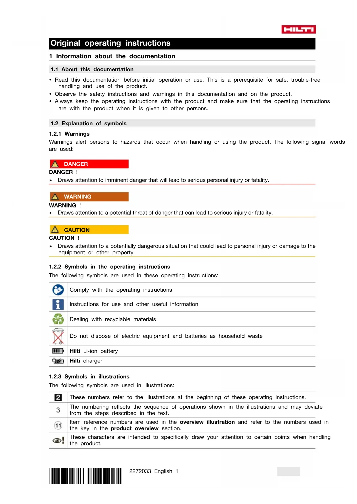 The following symbols are used in these operating instructions: Comply with the operating instructions Instructions for use and other useful information Dealing with recyclable materials Do not dispose of electric equipment and batteries as household waste Hilti Liion battery Hilti charger