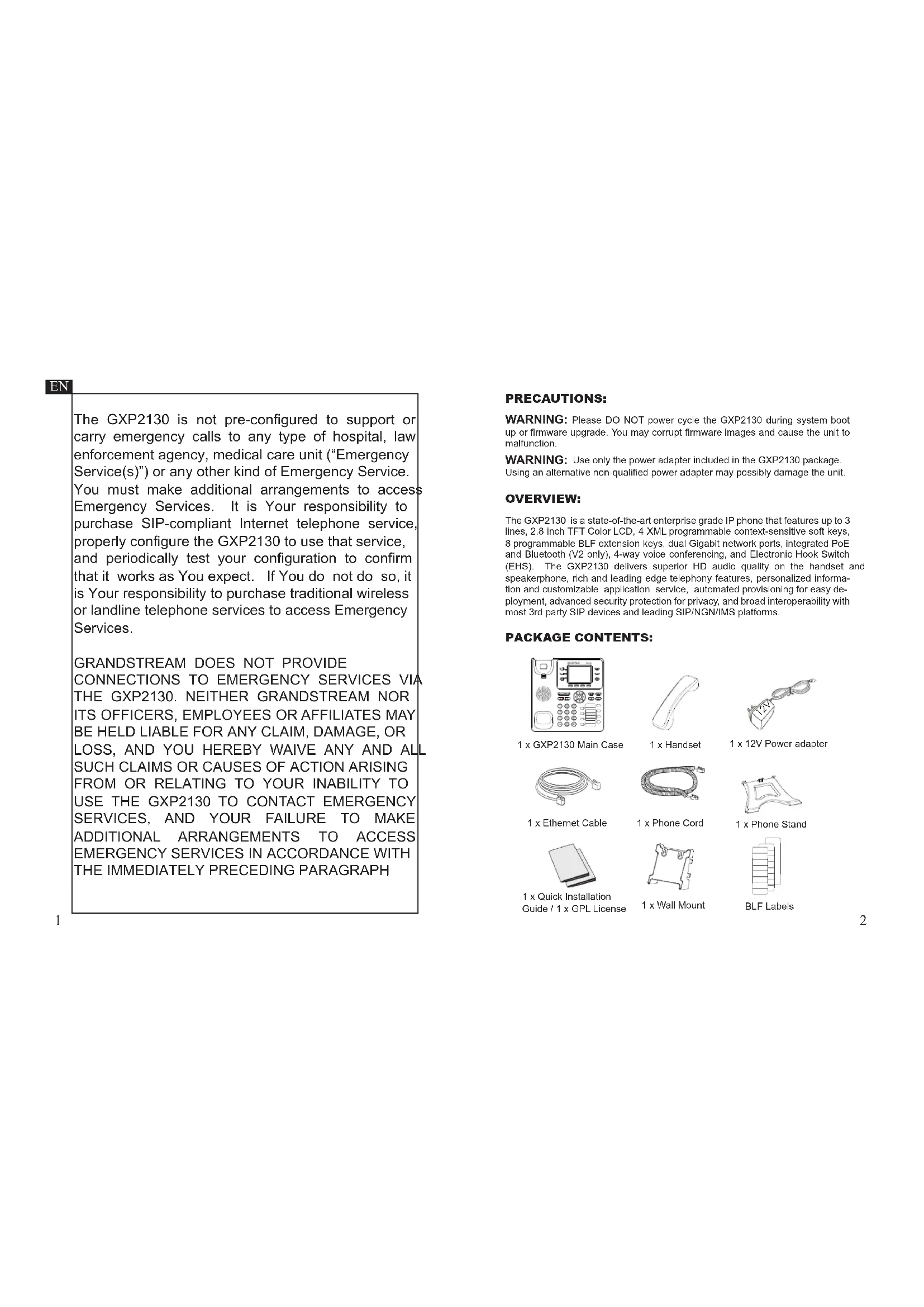 up or firmware upgrade. You may corrupt firmware images and cause the unit to malfunction. 1 x GXP2130 Main Case 1 x Handset 1 x Phone Cord1 x Ethernet Cable 1 x Phone Stand 1 x 12V Power adapter 1 x Quick Installation Guide / 1 x GPL License 1 x Wall Mount The GXP2130 is a state-of-the-art enterprise grade IP phone that features up to 3 lines, 2.8 inch TFT Color LCD, 4 XML programmable context-sensitive soft keys, 8 programmable BLF extension keys, dual Gigabit network ports, integrated PoE and Bluetooth (V2 only), 4-way voice conferencing, and Electronic Hook Switch (EHS). The GXP2130 delivers superior HD audio quality on the handset and speakerphone, rich and leading edge telephony features, personalized informa- tion and customizable application service, automated provisioning for easy de- ployment, advanced security protection for privacy, and broad interoperability with most 3rd party SIP devices and leading SIP/NGN/IMS platforms. PRECAUTIONS: