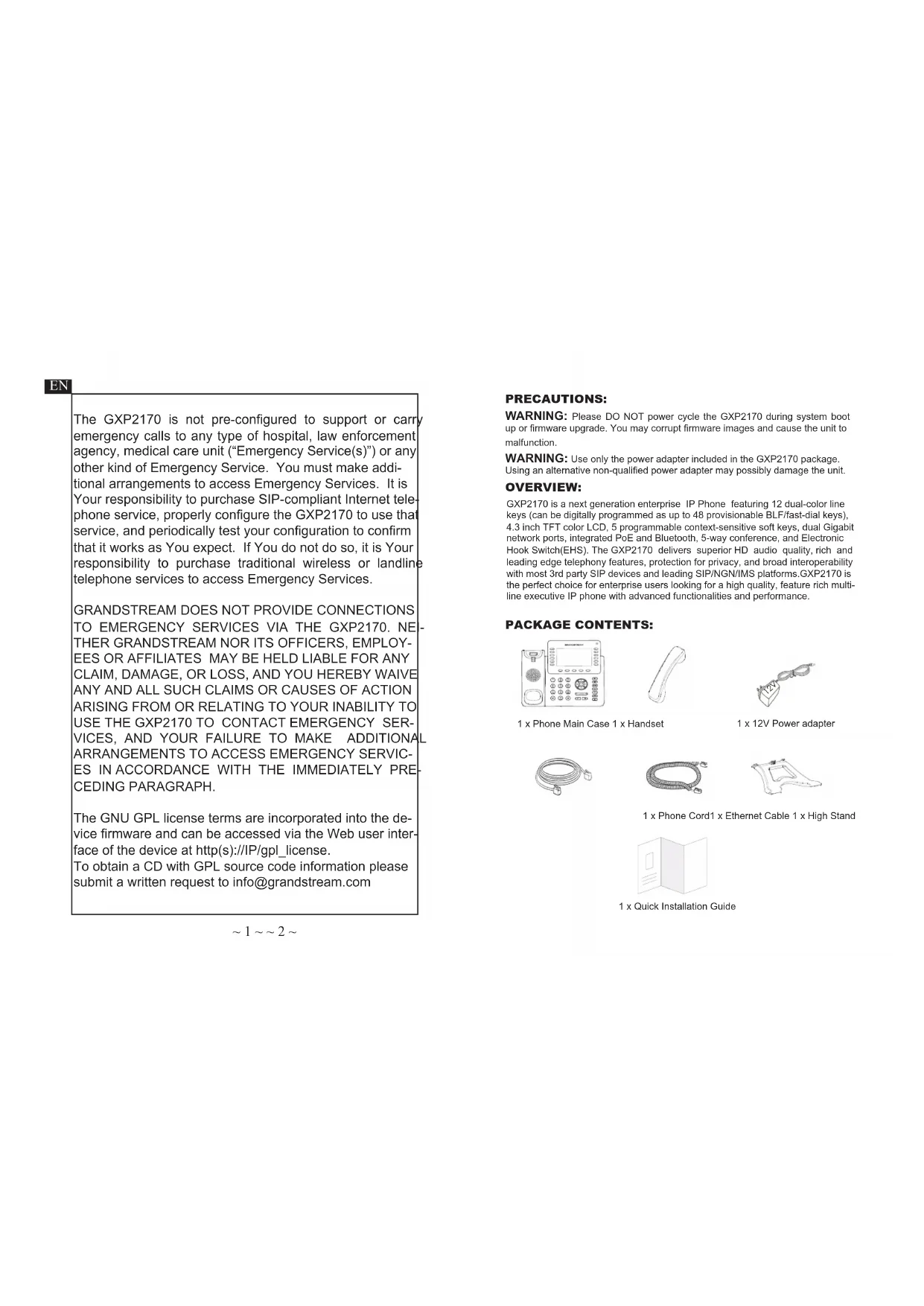 network ports, integrated PoE and Bluetooth, 5-way conference, and Electronic Hook Switch(EHS). The GXP2170 delivers superior HD audio quality, rich and leading edge telephony features, protection for privacy, and broad interoperability with most 3rd party SIP devices and leading SIP/NGN/IMS platforms.GXP2170 is the perfect choice for enterprise users looking for a high quality, feature rich multi- line executive IP phone with advanced functionalities and performance. PACKAGE CONTENTS: OVERVIEW:
