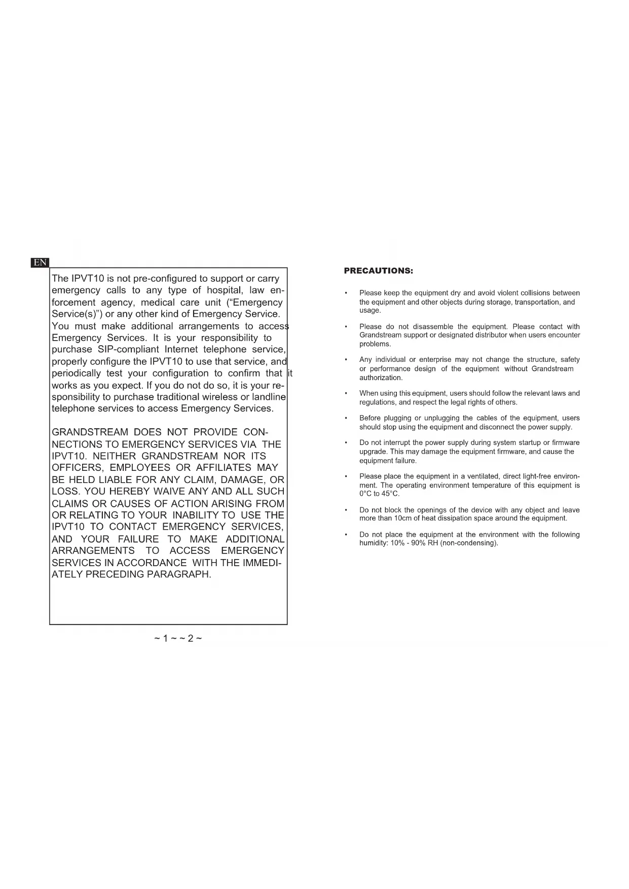 GRANDSTREAM DOES NOT PROVIDE CONNECTIONS TO EMERGENCY SERVICES VIA THE IPVT10. NEITHER GRANDSTREAM NOR ITS OFFICERS, EMPLOYEES OR AFFILIATES MAY BE HELD LIABLE FOR ANY CLAIM, DAMAGE, OR LOSS. YOU HEREBY WAIVE ANY AND ALL SUCH CLAIMS OR CAUSES OF ACTION ARISING FROM OR RELATING TO YOUR INABILITY TO USE THE IPVT10 TO CONTACT EMERGENCY SERVICES, AND YOUR FAILURE TO MAKE ADDITIONAL ARRANGEMENTS TO ACCESS EMERGENCY SERVICES IN ACCORDANCE WITH THE IMMEDIATELY PRECEDING PARAGRAPH.