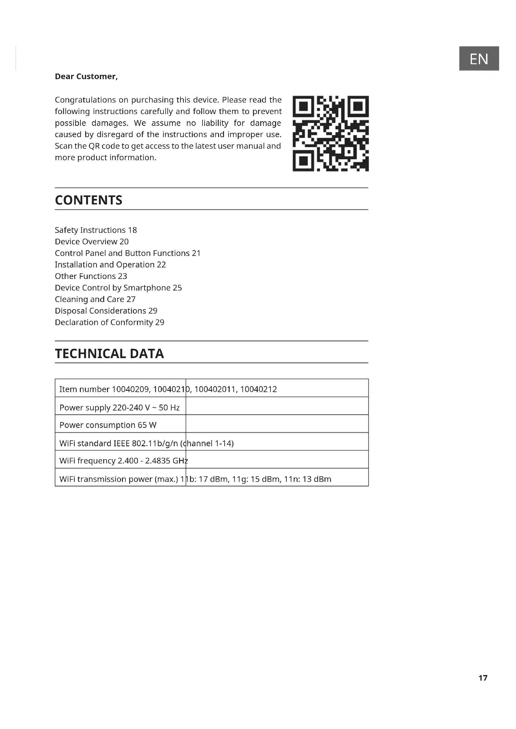 Dear Customer, Congratulations on purchasing this device. Please read the following instructions carefully and follow them to prevent possible damages. We assume no liability for damage caused by disregard of the instructions and improper use. Scan the QR code to get access to the latest user manual and more product information. CONTENTS Safety Instructions 18 Device Overview 20 Control Panel and Button Functions 21 Installation and Operation 22 Other Functions 23 Device Control by Smartphone 25 Cleaning and Care 27 Disposal Considerations 29 Declaration of Conformity 29 TECHNICAL DATA Item number 10040209, 10040210, 100402011, 10040212 Power supply 220-240 V ~ 50 Hz Power consumption 65 W WiFi standard IEEE 802.11b/g/n (channel 1-14) WiFi frequency 2.400 - 2.4835 GHz WiFi transmission power (max.) 11b: 17 dBm, 11g: 15 dBm, 11n: 13 dBm18