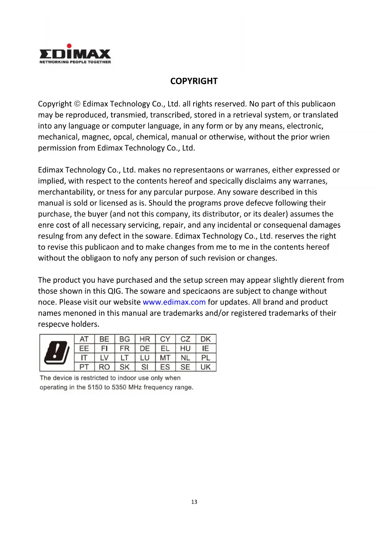 COPYRIGHT Copyright Edimax Technology Co., Ltd. all rights reserved. No part of this publication may be reproduced, transmitted, transcribed, stored in a retrieval system, or translated into any language or computer language, in any form or by any means, electronic, mechanical, magnetic, optical, chemical, manual or otherwise, without the prior written permission from Edimax Technology Co., Ltd. Edimax Technology Co., Ltd. makes no representations or warranties, either expressed or implied, with respect to the contents hereof and specifically disclaims any warranties, merchantability, or fitness for any particular purpose. Any software described in this manual is sold or licensed as is. Should the programs prove defective following their purchase, the buyer (and not this company, its distributor, or its dealer) assumes the entire cost of all necessary servicing, repair, and any incidental or consequential damages resulting from any defect in the software. Edimax Technology Co., Ltd. reserves the right to revise this publication and to make changes from time to time in the contents hereof without the obligation to notify any person of such revision or changes. The product you have purchased and the setup screen may appear slightly different from those shown in this QIG. The software and specifications are subject to change without notice. Please visit our website www.edimax.com for updates. All brand and product names mentioned in this manual are trademarks and/or registered trademarks of their respective holders.14 Federal Communication Commission Interference Statement This equipment has been tested and found to comply with the limits for a Class B digital device, pursuant to Part 15 of FCC Rules. These limits are designed to provide reasonable protection against harmful interference in a residential installation. This equipment generates, uses, and can radiate radio frequency energy and, if not installed and used in accordance with the instructions, may cause harmful interference to radio communications. However, there is no guarantee that interference will not occur in a particular installation. If this equipment does cause harmful interference to radio or television reception, which can be determined by turning the equipment off and on, the user is encouraged to try to correct the interference by one or more of the following measures: