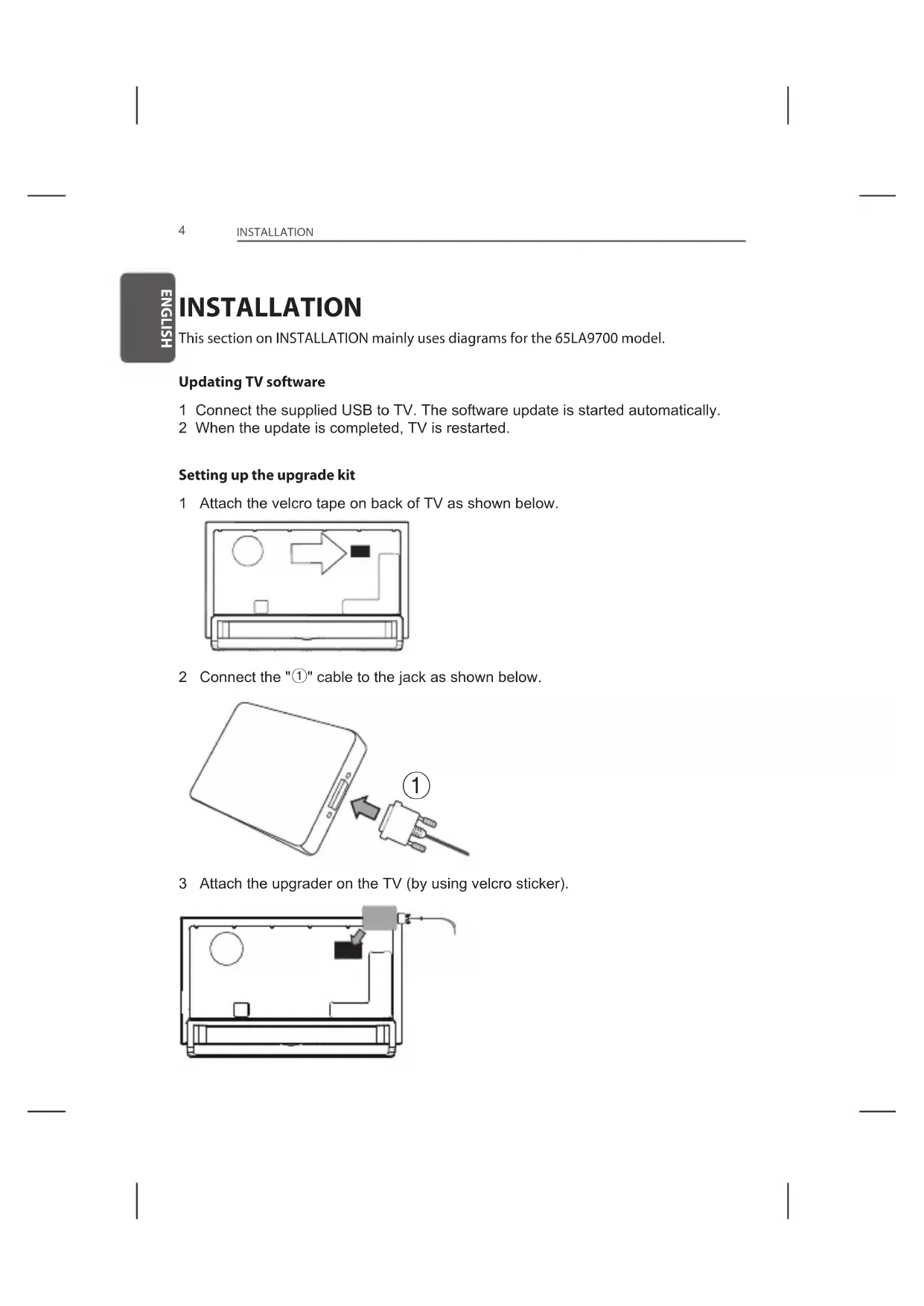 This ULTRA HD Upgrade Kit allows the playback of ULTRA HD Video content on LG ULTRA HD TV’S. PREPARATION Unpacking ULTRA HD Upgrader Y Cable Velcro sticker Owner’s manual USB memory stick (TV Software file)4 ENGLISH INSTALLATION INSTALLATION This section on INSTALLATION mainly uses diagrams for the 65LA9700 model. Updating TV software 1 Connect the supplied USB to TV. The software update is started automatically. 2 When the update is completed, TV is restarted. Setting up the upgrade kit 1 Attach the velcro tape on back of TV as shown below.