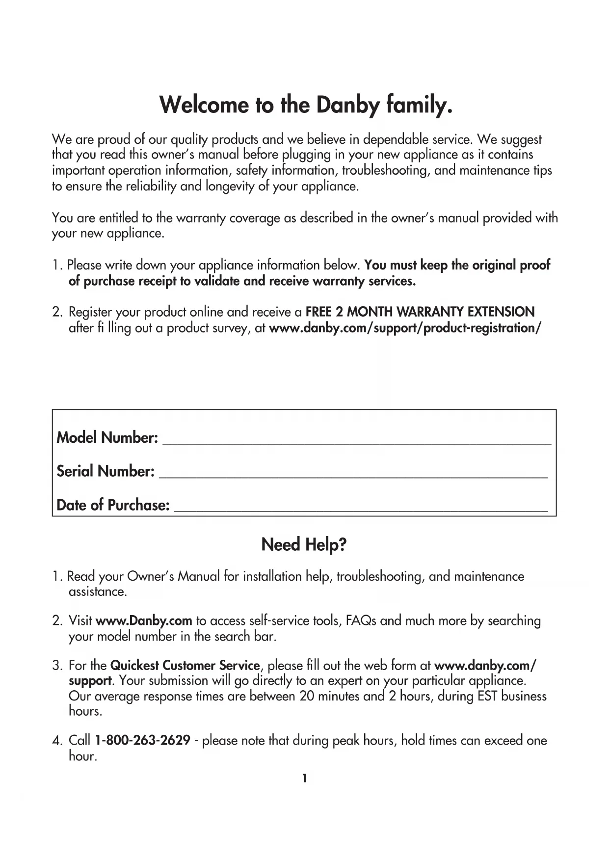 - Register your product online and receive a FREE 2 MONTH WARRANTY EXTENSION after fi lling out a product survey, at www.danby.com/support/product-registration/