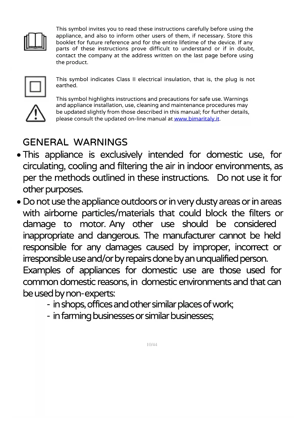 This symbol indicates Class II electrical insulation, that is, the plug is not earthed. This symbol highlights instructions and precautions for safe use. Warnings and appliance installation, use, cleaning and maintenance procedures may be updated slightly from those described in this manual; for further details, please consult the updated on-line manual at www.bimaritaly.it.