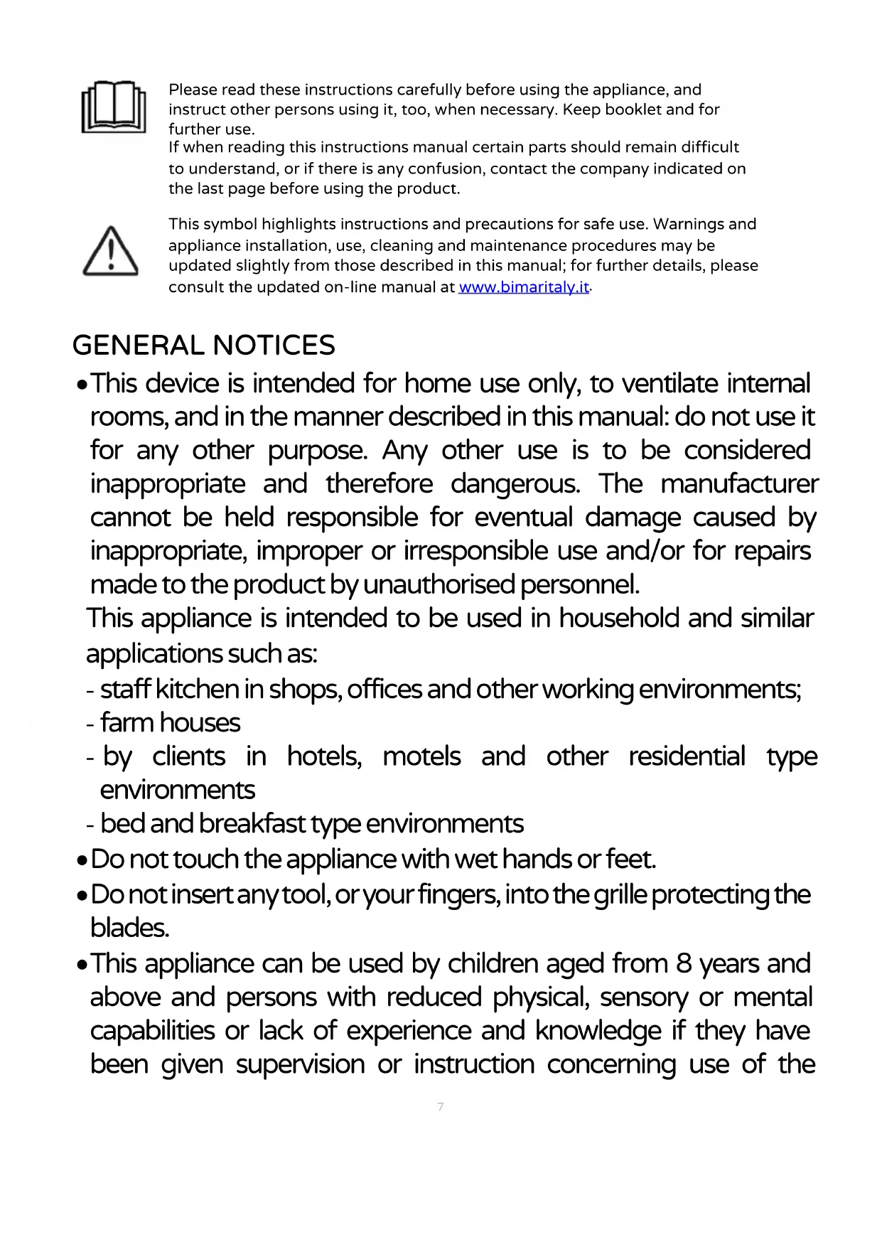 - This device is intended for home use only, to ventilate internal rooms, and in the manner described in this manual: do not use it for any other purpose. Any other use is to be considered inappropriate and therefore dangerous. The manufacturer cannot be held responsible for eventual damage caused by inappropriate, improper or irresponsible use and/or for repairs made to the product by unauthorised personnel. This appliance is intended to be used in household and similar applications such as: - staff kitchen in shops, offices and other working environments; - farm houses - by clients in hotels, motels and other residential type environments - bed and breakfast type environments