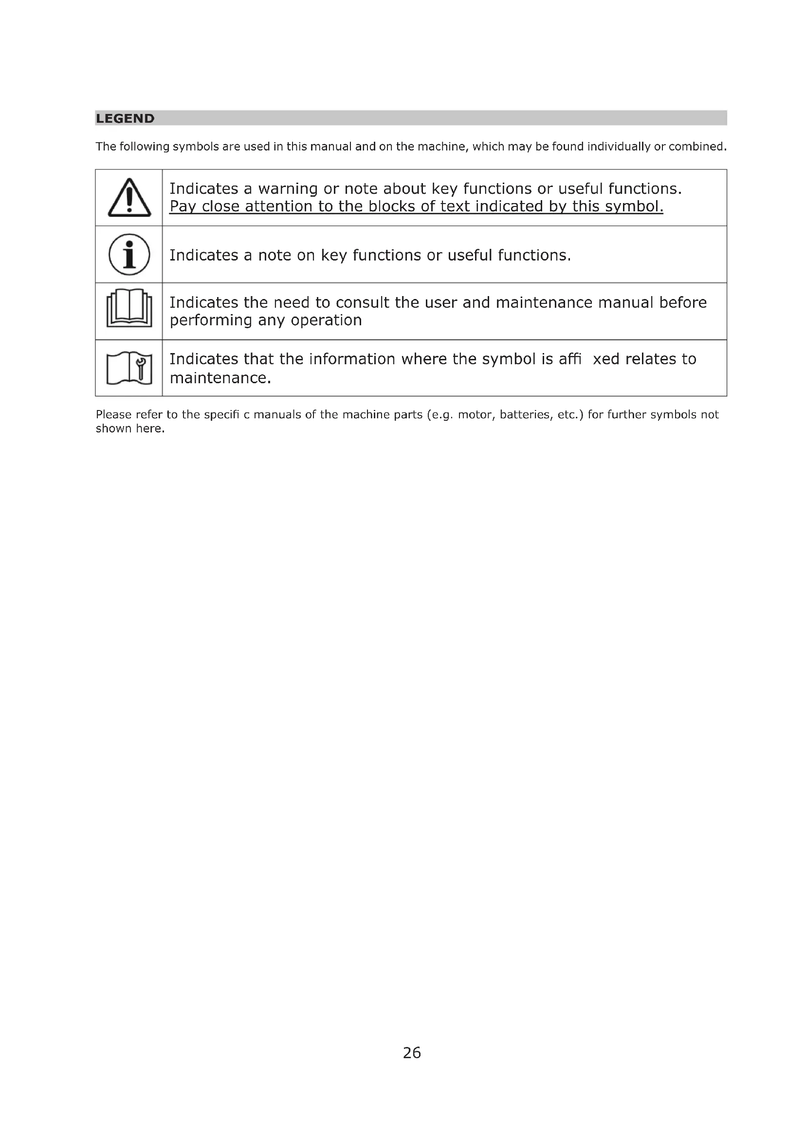 LEGEND The following symbols are used in this manual and on the machine, which may be found individually or combined. Indicates a warning or note about key functions or useful functions. Pay close attention to the blocks of text indicated by this symbol. Indicates a note on key functions or useful functions. Indicates the need to consult the user and maintenance manual before performing any operation Indicates that the information where the symbol is a xed relates to maintenance. Please refer to the speci c manuals of the machine parts (e.g. motor, batteries, etc.) for further symbols not shown here.27