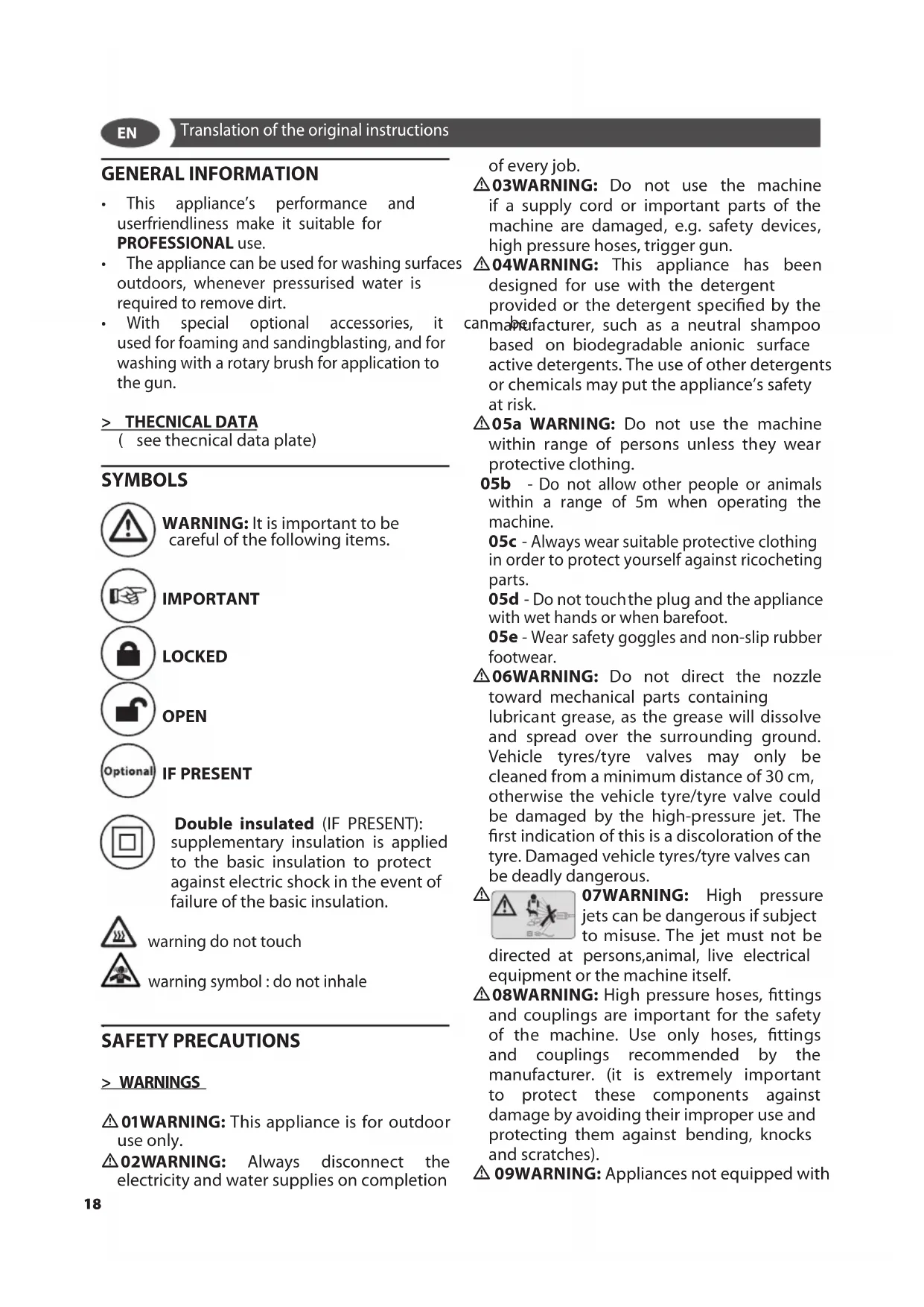 07WARNING: High pressure jets can be dangerous if subject to misuse. The jet must not be directed at persons,animal, live electrical equipment or the machine itself.