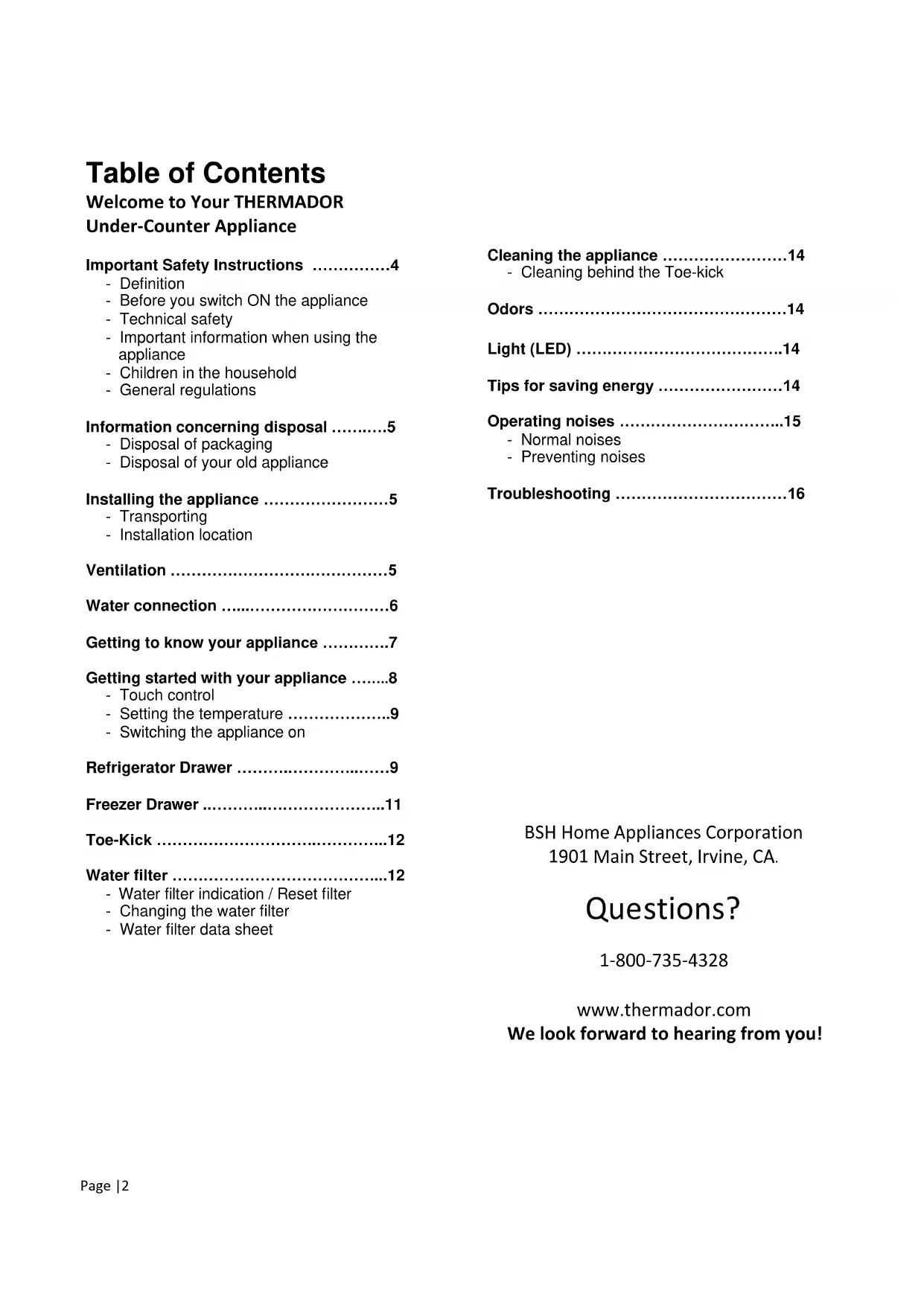 - Table of Contents Welcome to Your THERMADOR Under-Counter Appliance Important Safety Instructions ……………4 - Definition - Before you switch ON the appliance - Technical safety - Important information when using the appliance - Children in the household - General regulations Information concerning disposal …….….5 - Disposal of packaging - Disposal of your old appliance Installing the appliance ……………………5 - Transporting - Installation location Ventilation ……………………………………5 Water connection …