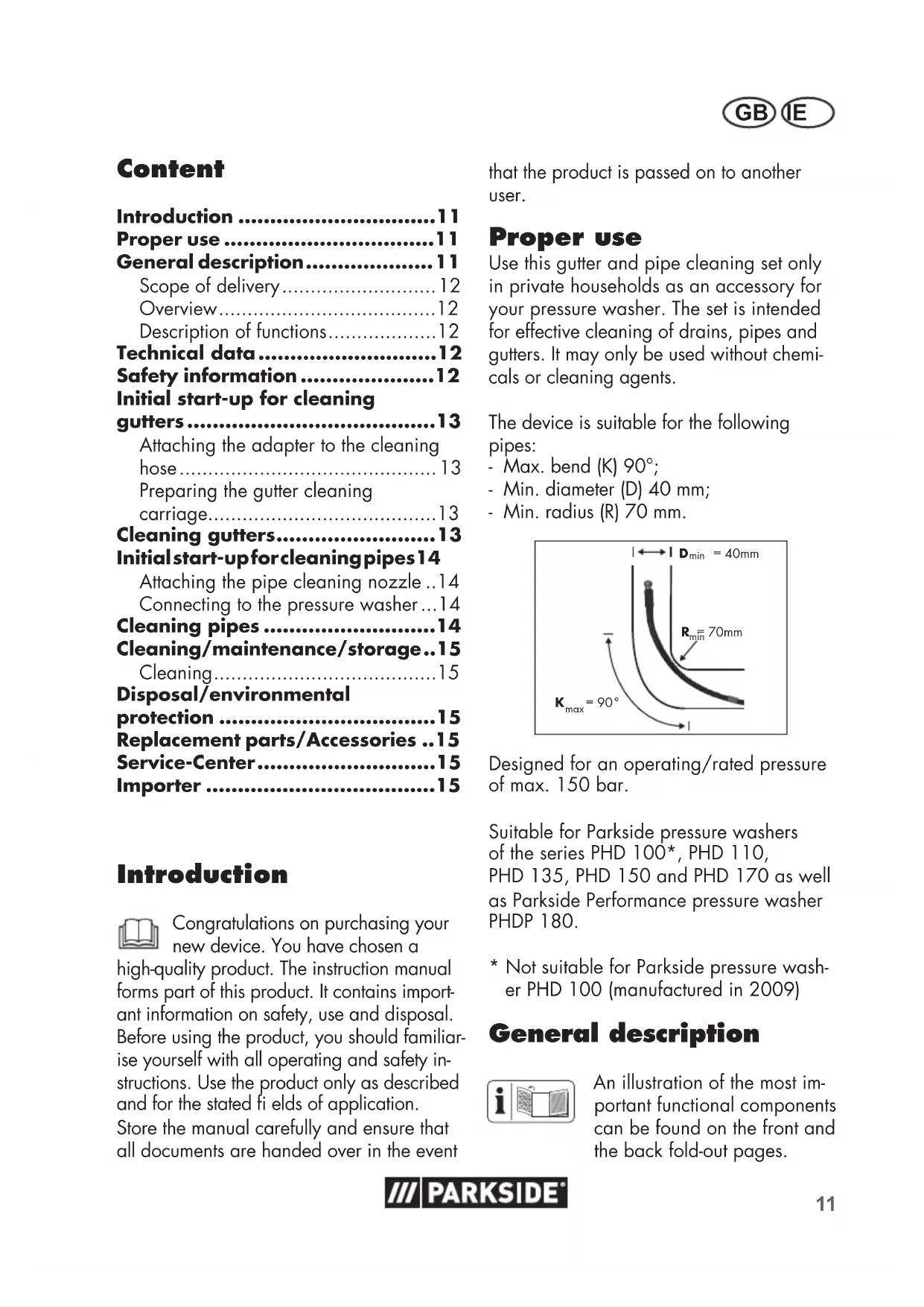 - Not suitable for Parkside pressure washer PHD 100 (manufactured in 2009)