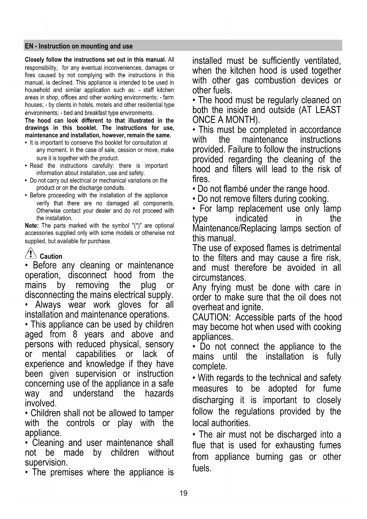 - Before any cleaning or maintenance operation, disconnect hood from the mains by removing the plug or disconnecting the mains electrical supply.