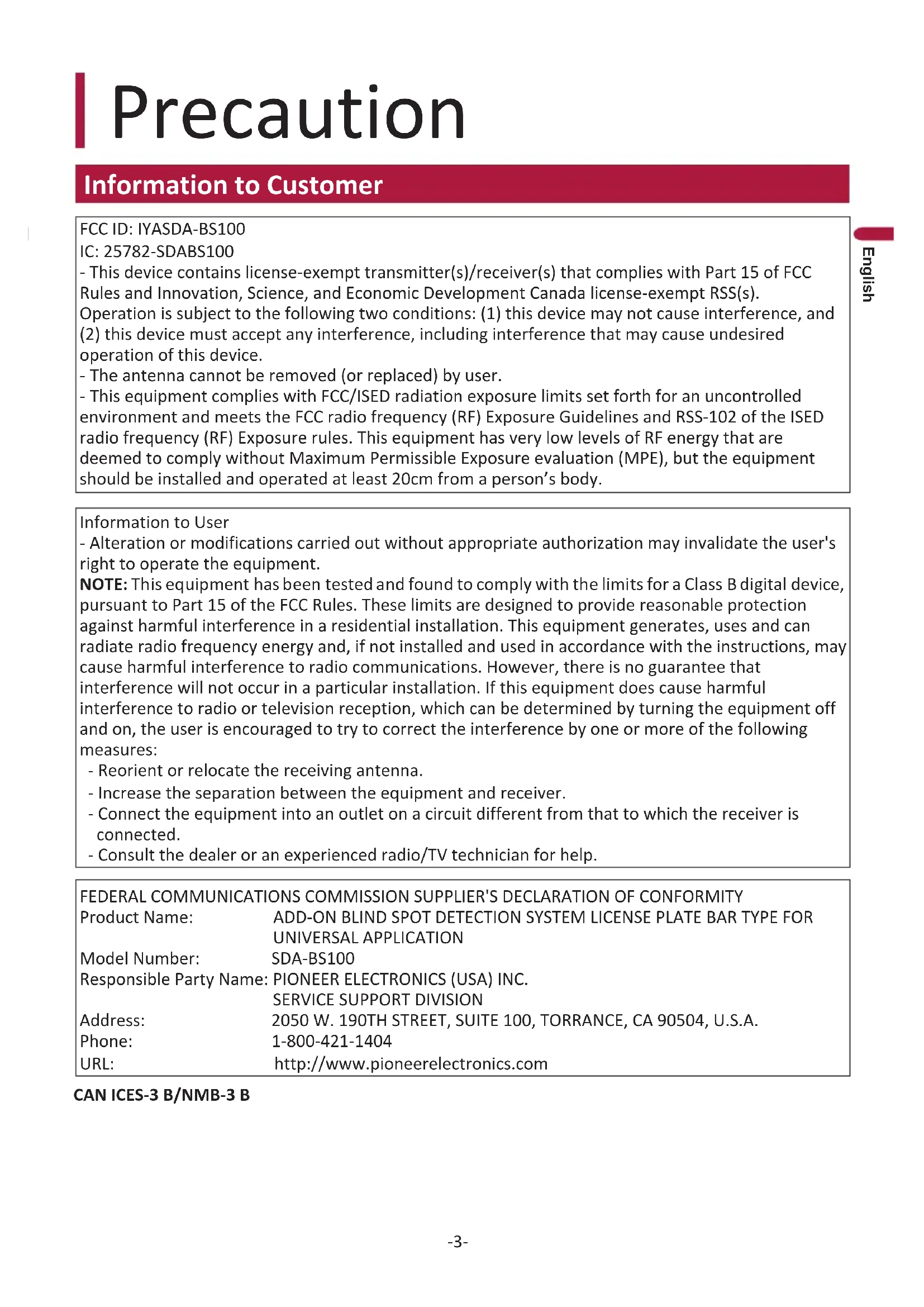 The antenna cannot be removed (or replaced) by user. This equipment complies with FCC/ISED radiation exposure limits set forth for an uncontrolled environment and meets the FCC radio frequency (RF) Exposure Guidelines and RSS-102 of the ISED radio frequency (RF) Exposure rules. This equipment has very low levels of RF energy that are deemed to comply without Maximum Permissible Exposure evaluation (MPE), but the equipment should be installed and operated at least 20cm from a person’s body. Information to User - Alteration or modifications carried out without appropriate authorization may invalidate the user's right to operate the equipment. NOTE: This equipment has been tested and found to comply with the limits for a Class B digital device, pursuant to Part 15 of the FCC Rules. These limits are designed to provide reasonable protection against harmful interference in a residential installation. This equipment generates, uses and can radiate radio frequency energy and, if not installed and used in accordance with the instructions, may cause harmful interference to radio communications. However, there is no guarantee that interference will not occur in a particular installation. If this equipment does cause harmful interference to radio or television reception, which can be determined by turning the equipment off and on, the user is encouraged to try to correct the interference by one or more of the following measures: - Reorient or relocate the receiving antenna. - Increase the separation between the equipment and receiver. - Connect the equipment into an outlet on a circuit different from that to which the receiver is connected. - Consult the dealer or an experienced radio/TV technician for help. FEDERAL COMMUNICATIONS COMMISSION SUPPLIER'S DECLARATION OF CONFORMITY Product Name: ADD-ON BLIND SPOT DETECTION SYSTEM LICENSE PLATE BAR TYPE FOR UNIVERSAL APPLICATION Model Number: SDA-BS100 Responsible Party Name: PIONEER ELECTRONICS (USA) INC.