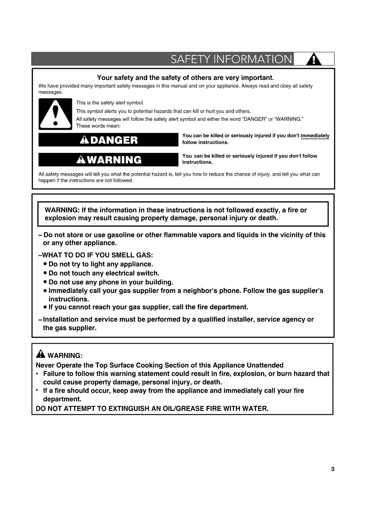 Never Operate the Top Surface Cooking Section of this Appliance Unattended Failure to follow this warning statement could result in fire, explosion, or burn hazard that could cause property damage, personal injury, or death. If a fire should occur, keep away from the appliance and immediately call your fire department. DO NOT ATTEMPT TO EXTINGUISH AN OIL/GREASE FIRE WITH WATER.