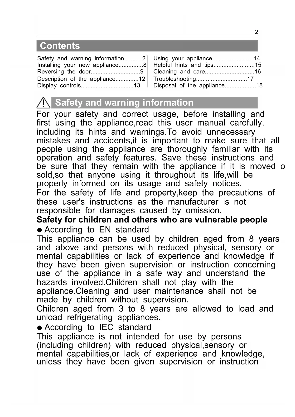 For your safety and correct usage, before installing and first using the appliance, read this user manual carefully, including its hints and warnings. To avoid unnecessary mistakes and accidents, it is important to make sure that all people using the appliance are thoroughly familiar with its operation and safety features. Save these instructions and be sure that they remain with the appliance if it is moved or sold, so that anyone using it throughout its life, will be properly informed on its usage and safety notices.