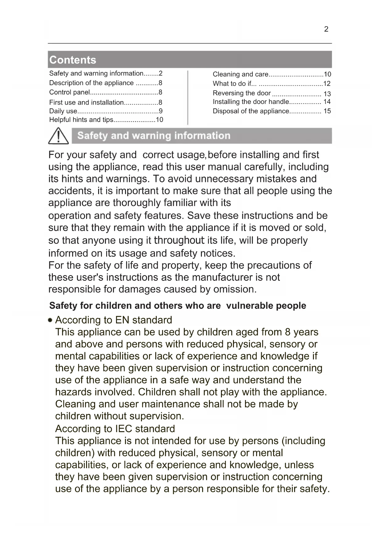 - responsible for damages caused by omission. Safety for children and others who are vulnerable people According to EN standard According to IEC standard This appliance is not intended for use by persons (including children) with reduced physical, sensory or mental capabilities, or lack of experience and knowledge, unless they have been given supervision or instruction concerning use of the appliance by a person responsible for their safety. This appliance can be used by children aged from 8 years and above and persons with reduced physical, sensory or mental capabilities or lack of experience and knowledge if they have been given supervision or instruction concerning use of the appliance in a safe way and understand the hazards involved. Children shall not play with the appliance. Cleaning and user maintenance shall not be made by children without supervision. Safety and warning information p. 2