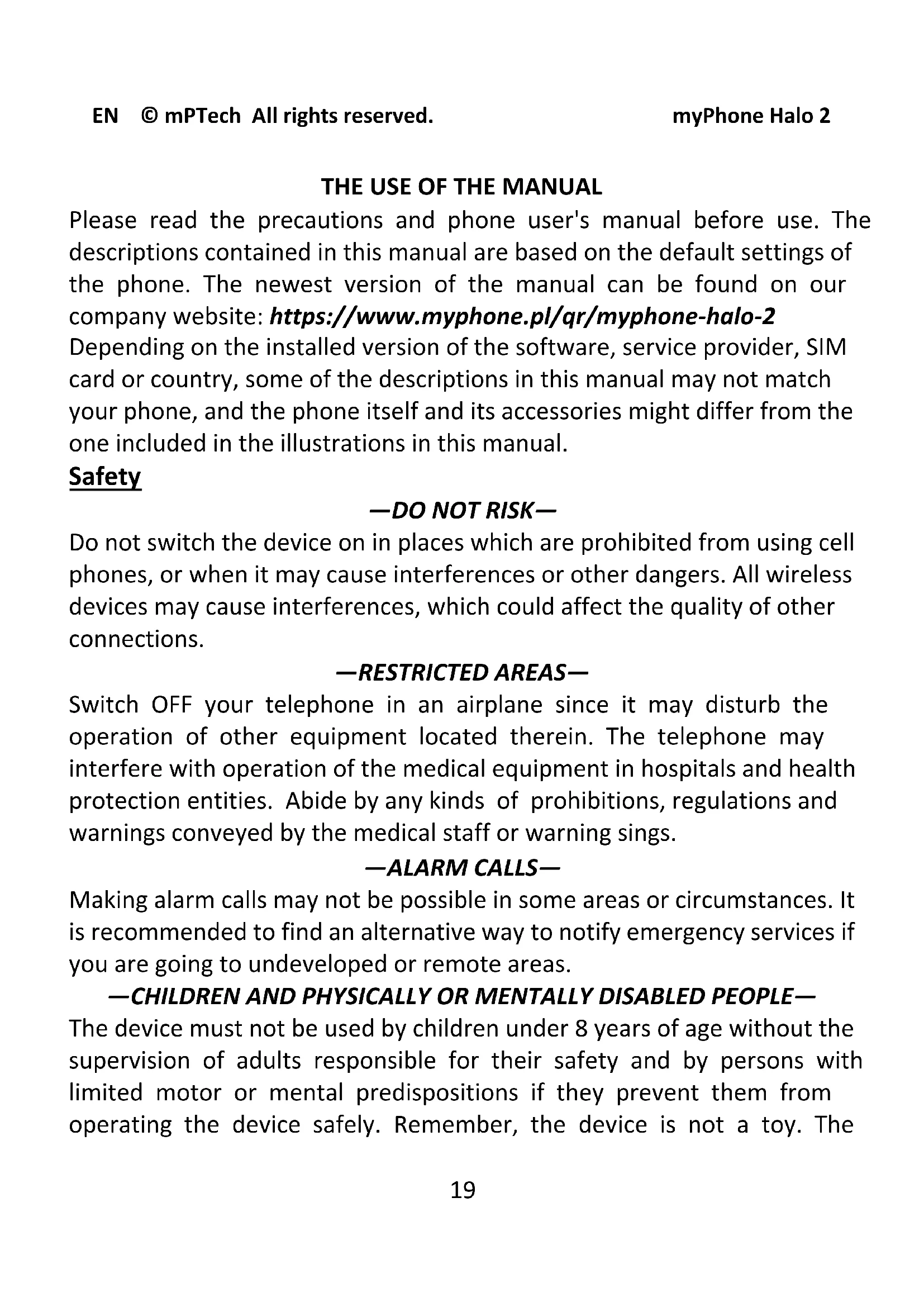 Do not switch the device on in places which are prohibited from using cell phones, or when it may cause interferences or other dangers. All wireless devices may cause interferences, which could affect the quality of other connections. —RESTRICTED AREAS— Switch OFF your telephone in an airplane since it may disturb the operation of other equipment located therein. The telephone may interfere with operation of the medical equipment in hospitals and health protection entities. Abide by any kinds of prohibitions, regulations and warnings conveyed by the medical staff or warning sings. —ALARM CALLS— Making alarm calls may not be possible in some areas or circumstances. It is recommended to find an alternative way to notify emergency services if you are going to undeveloped or remote areas. —CHILDREN AND PHYSICALLY OR MENTALLY DISABLED PEOPLE— The device must not be used by children under 8 years of age without the supervision of adults responsible for their safety and by persons with limited motor or mental predispositions if they prevent them from operating the device safely. Remember, the device is not a toy. TheEN © mPTech All rights reserved. myPhone Halo 2