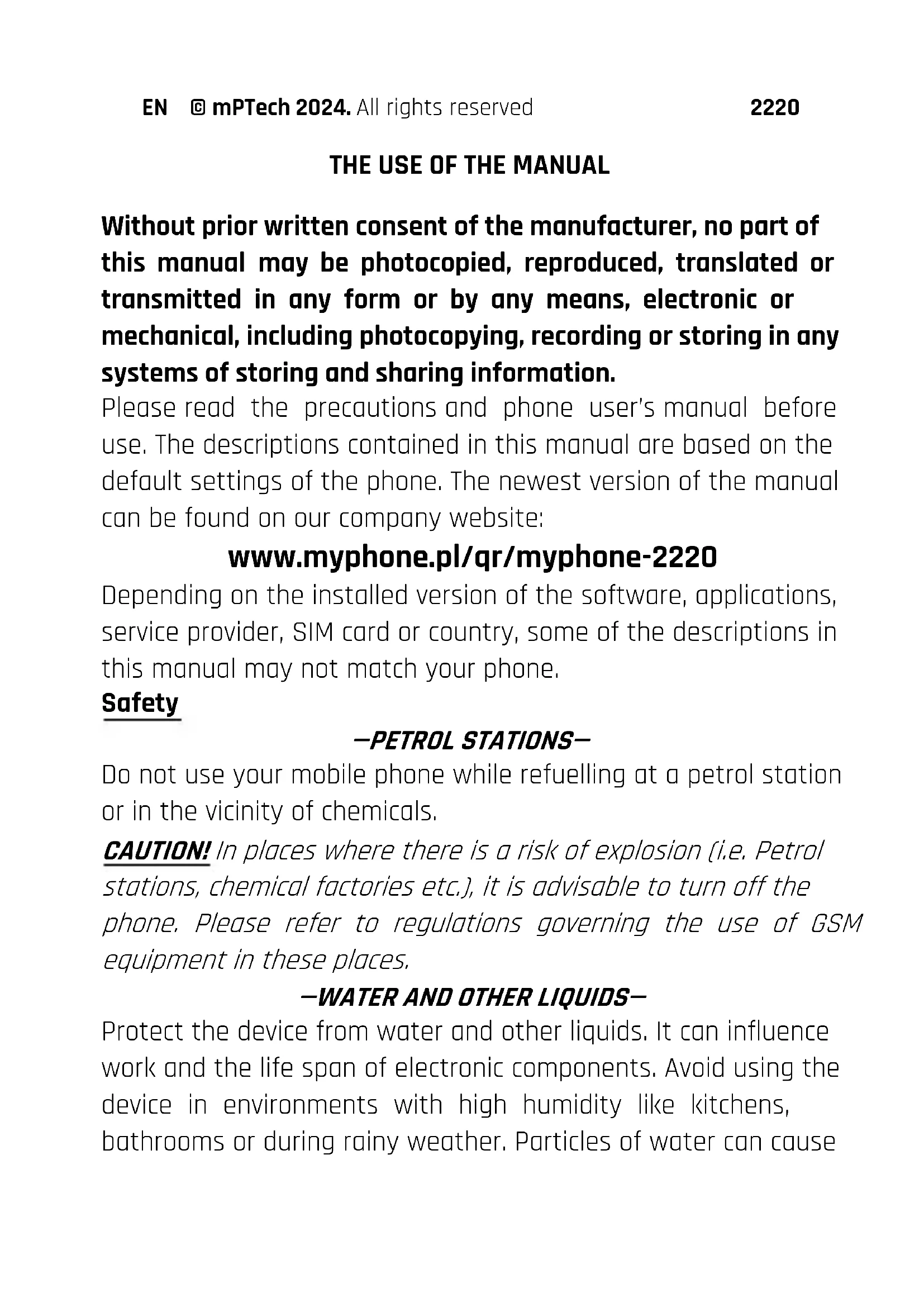 Without prior written consent of the manufacturer, no part of this manual may be photocopied, reproduced, translated or transmitted in any form or by any means, electronic or mechanical, including photocopying, recording or storing in any systems of storing and sharing information. Please read the precautions and phone user’s manual before use. The descriptions contained in this manual are based on the default settings of the phone. The newest version of the manual can be found on our company website: www.myphone.pl/qr/myphone-2220 Depending on the installed version of the software, applications, service provider, SIM card or country, some of the descriptions in this manual may not match your phone. Safety —PETROL STATIONS— Do not use your mobile phone while refuelling at a petrol station or in the vicinity of chemicals. CAUTION! In places where there is a risk of explosion (i.e. Petrol stations, chemical factories etc.), it is advisable to turn off the phone. Please refer to regulations governing the use of GSM equipment in these places.