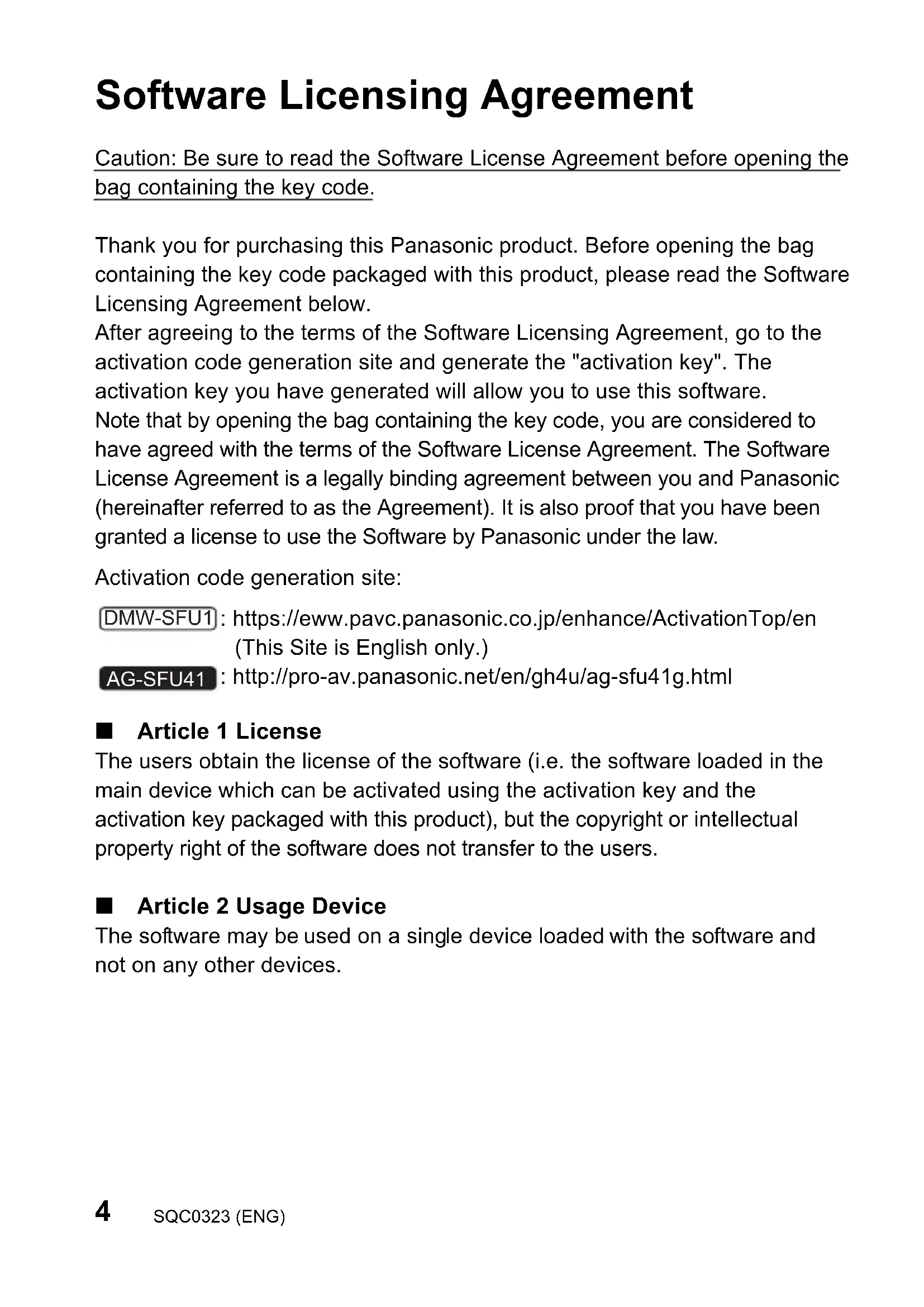 Software Licensing Agreement Caution: Be sure to read the Software License Agreement before opening the bag containing the key code. Thank you for purchasing this Panasonic product. Before opening the bag containing the key code packaged with this product, please read the Software Licensing Agreement below. After agreeing to the terms of the Software Licensing Agreement, go to the activation code generation site and generate the "activation key". The activation key you have generated will allow you to use this software. Note that by opening the bag containing the key code, you are considered to have agreed with the terms of the Software License Agreement. The Software License Agreement is a legally binding agreement between you and Panasonic (hereinafter referred to as the Agreement). It is also proof that you have been granted a license to use the Software by Panasonic under the law. Activation code generation site: ∫ Article 1 License The users obtain the license of the software (i.e. the software loaded in the main device which can be activated using the activation key and the activation key packaged with this product), but the copyright or intellectual property right of the software does not transfer to the users. ∫ Article 2 Usage Device The software may be used on a single device loaded with the software and not on any other devices. : https://eww.pavc.panasonic.co.jp/enhance/ActivationTop/en (This Site is English only.) : http://pro-av.panasonic.net/en/gh4u/ag-sfu41g.html DMW-SFU1 AG-SFU41 DMC-SFU1-SQC0323.book 4 ページ 2022年2月24日 木曜日 午後1時27分5 (ENG) SQC0323 ENGLISH ∫ Article 3 Reverse Engineering, Decompiling or Disassembly The Software is provided to you as is, and Panasonic makes no express or implied warranties whatsoever with respect to the Software. You may not reverse engineer, decompile, or disassemble the Software. Panasonic or any of its distributors or dealers shall not be bound by warranty for any defects in the Software or damage to you caused by your reverse engineering, decompiling, or disassembly of the Software. ∫ Article 4 Indemnification Panasonic or any of its distributors or dealers shall not be liable for any damage suffered by Licensee, either directly or through claims from a third party, arising from or in connection with Licensee’s use of the Software. Furthermore, Panasonic does not guarantee the successful operation of the software unless it is used with any of Panasonic. ∫ Article 5 Changes to Specifications Panasonic may change the information in the specifications and related documents for the Software without prior notice in the future. ∫ Article 6 Export Control You shall comply with all laws and regulations related to export control at home and abroad with respect to the Software. ∫ Article 7 Legal system This document shall be governed by and construed and enforced in accordance with the laws of Japan, without regard to its conflict of law provisions. ∫ Article 8 Conflict resolution Any dispute arising out of or in relation to this document shall be subject to the exclusive jurisdiction of the Osaka District Court. Please note the following.