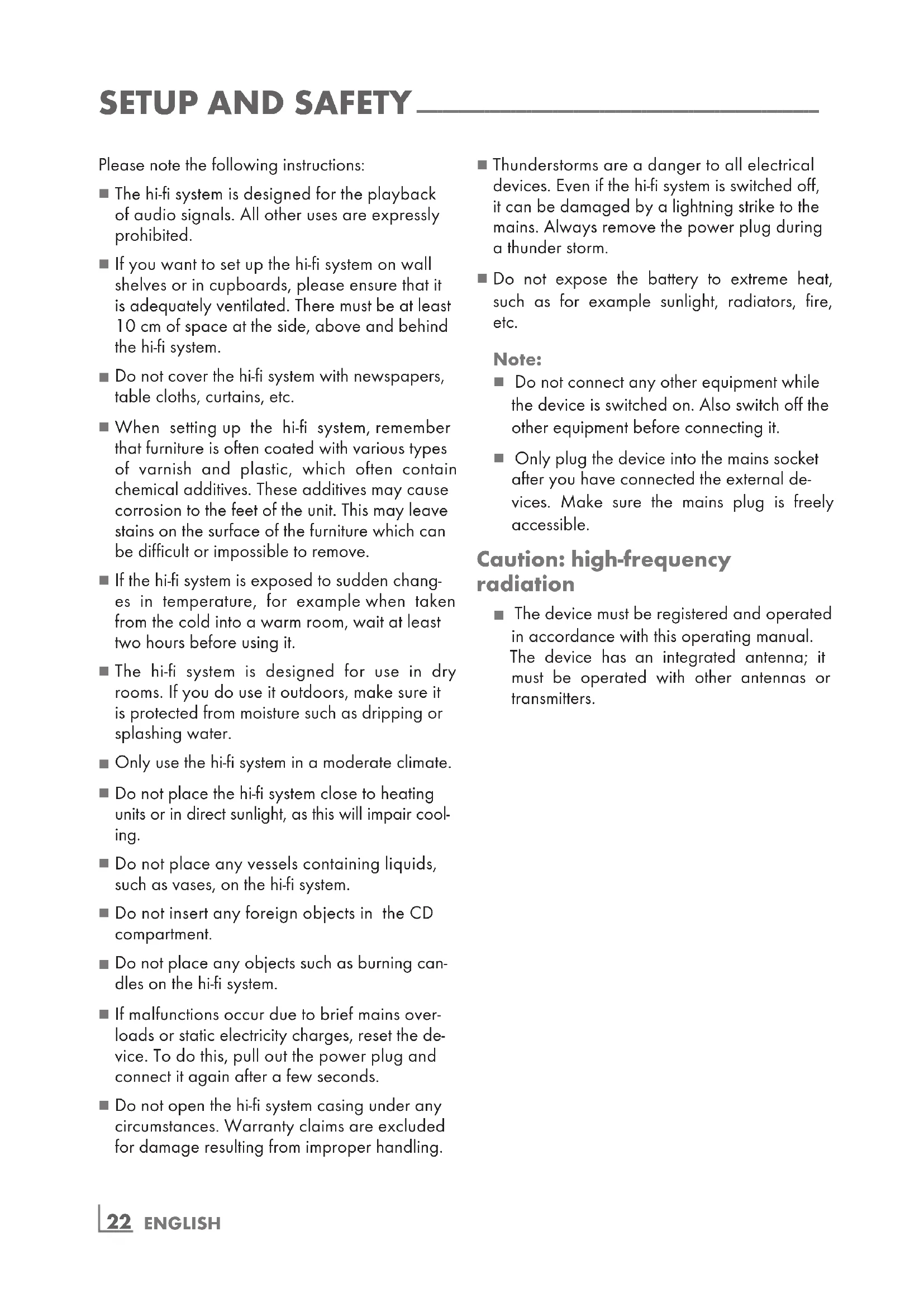 Only use the hi-fi system in a moderate climate.