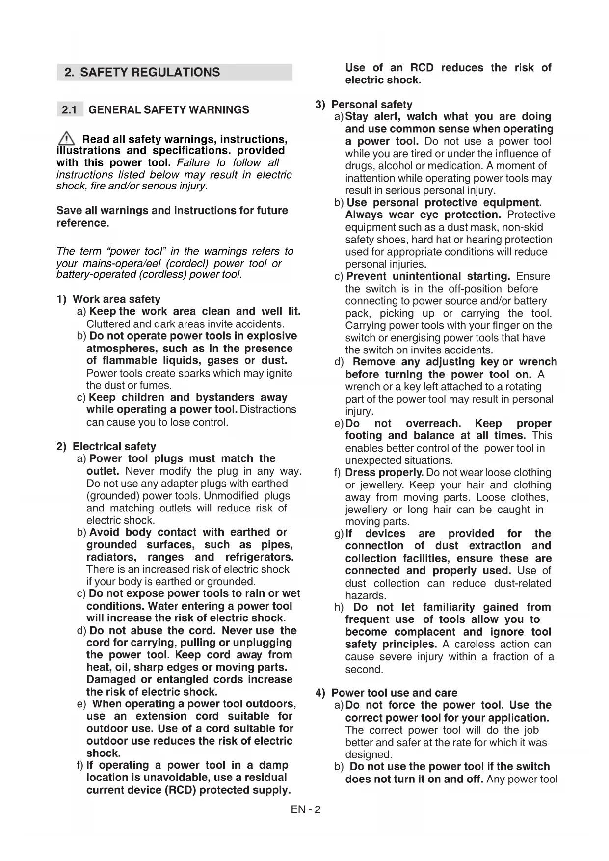 Read all safety warnings, instructions, illustrations and specications. provided with this power tool. Failure lo follow all instructions listed below may result in electric shock, re and/or serious injury. Save all warnings and instructions for future reference. The term “power tool” in the warnings refers to your mains-opera/eel (cordecl) power tool or battery-operated (cordless) power tool.