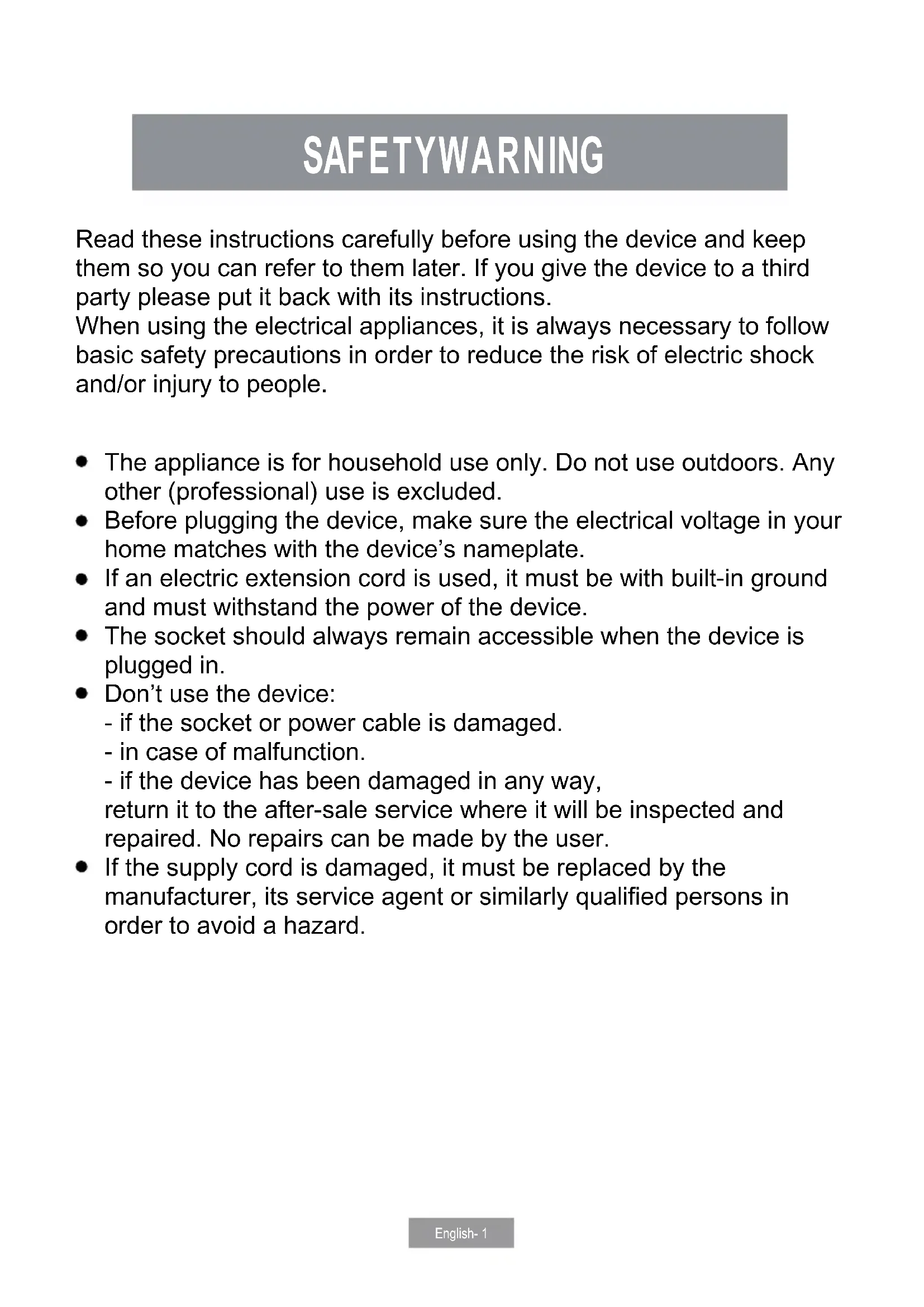 France Ce marquage indique que ce produit ne doit pas être jeté avec les autres déchets ménagers dans toute l'UE. Pour éviter d'éventuels dommages à l'environnement ou à la santé humaine dus à une élimination incontrôlée des déchets, recyclez-les de manière responsable afin de promouvoir la réutilisation durable des ressources matérielles. Pour retourner votre appareil usagé, veuillez utiliser les systèmes de retour et de collecte ou contacter le revendeur où le produit a été acheté. Ils peuvent prendre ce produit pour un recyclage sans danger pour l'environnement.English- 1 SAFETYWARNING Read these instructions carefully before using the device and keep them so you can refer to them later. If you give the device to a third party please put it back with its instructions. When using the electrical appliances, it is always necessary to follow basic safety precautions in order to reduce the risk of electric shock and/or injury to people. The appliance is for household use only. Do not use outdoors. Any other (professional) use is excluded. Before plugging the device, make sure the electrical voltage in your home matches with the device’s nameplate. If an electric extension cord is used, it must be with built-in ground and must withstand the power of the device. The socket should always remain accessible when the device is plugged in. Don’t use the device: - if the socket or power cable is damaged. - in case of malfunction. - if the device has been damaged in any way, return it to the after-sale service where it will be inspected and repaired. No repairs can be made by the user. If the supply cord is damaged, it must be replaced by the manufacturer, its service agent or similarly qualified persons in order to avoid a hazard.English- 2 Don't move the device when it's working. When you need to unplug the power cable, always pull the plug but not pull the cable itself. Never let the device operate unattended. Never immerse the device and the cable into the water or any other liquid. Do not put this device near any heat source such as gas or electric cook oven or any other devices producing heat. Appliances can be used by persons with reduced physical, sensory or mental capabilities or lack of experience and knowledge if they have been given supervision or instruction concerning use of the appliance in a safe way and understand the hazards involved. Children shall not play with the appliance. This appliance can be used by children aged from 8 years and above if they have been given supervision or instruction concerning use of the appliance in a safe way and if they understand the hazards involved. Cleaning and user maintenance shall not be made by children unless they are older than 8 and supervised. Keep the appliance and its cord out of reach of children aged less than 8 years. Never leave your device in the humidity place. Do not handle the device or power cable with wet hands. Do not touch the surfaces during use, and do not let the power cable come into contact with the hot surfaces of the device. Don’t use the device as extra heating. Always put the device on a flat, stable, heat-resistant surface. Never place your device on a fragile support (glazed furniture, glass table, etc.) or a soft, heat-resistant support. Do not operate the device under a wall cabinet or near flammable products or inflammable materials (paper, cardboard, etc.). Always unplug your device after each use and before cleaning and storage. ATTENTION: accessible surfaces can become very hot during the operation of the device. Never touch metal parts that are very hot when in use: you may burn yourself !English- 3 Use only the accessories provided with this device. Any misuses or not comply with this instruction may lead to a danger to the user and may damage the device. The device is not intended to be operated by means of an external timer or separate remote-control system. Always disconnect the appliance from the supply if it is left unattended and before assembling, disassembling or cleaning. The heating element on the inner side of the base becomes very hot. And the surface is subject to residual heat after use. Never touch this, you can get very serious burns. To clean surfaces which contact with food please refers to the section “CLEANING AND MAINTENANCE”. Leave a minimum of 15 cm of free space around the device when it works. Never cover the device with aluminum foil and never place dishes, plates etc on the cooking surface.0