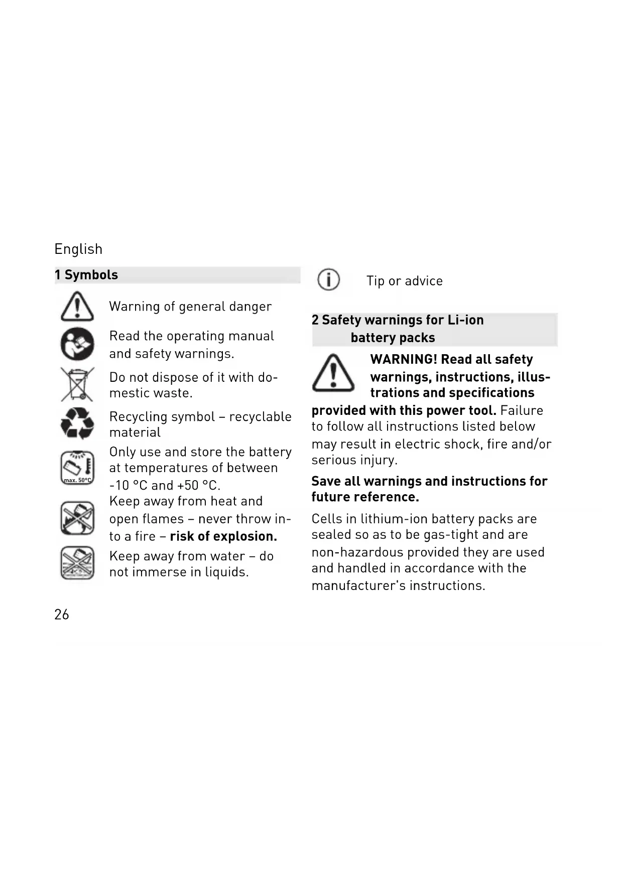 use of the battery pack The battery pack is delivered partially charged. To guarantee that the battery pack provides full power, charge it completely in the charger before using it for the first time. The battery pack can be charged at any time without reducing the battery life. Interrupting the charging process does not damage the battery pack. After the power tool has switched off automatically, do not press the on/off but ton. This could damage the battery pack. The battery pack is fitted with a temper ature sensor, which only permits charg ing at temperatures of between 0 °C and 55 °C. This ensures a longer battery life. – The battery pack should ideally be stored in a cool (5 °C to 25 °C) and dry location (air humidity < 80%). English 31– Do not, for instance, leave the battery pack in the car in the summer. – Significantly shorter operating times after each charge indicate that the battery pack is worn and should be replaced with a new one. – Observe the information regarding disposal.