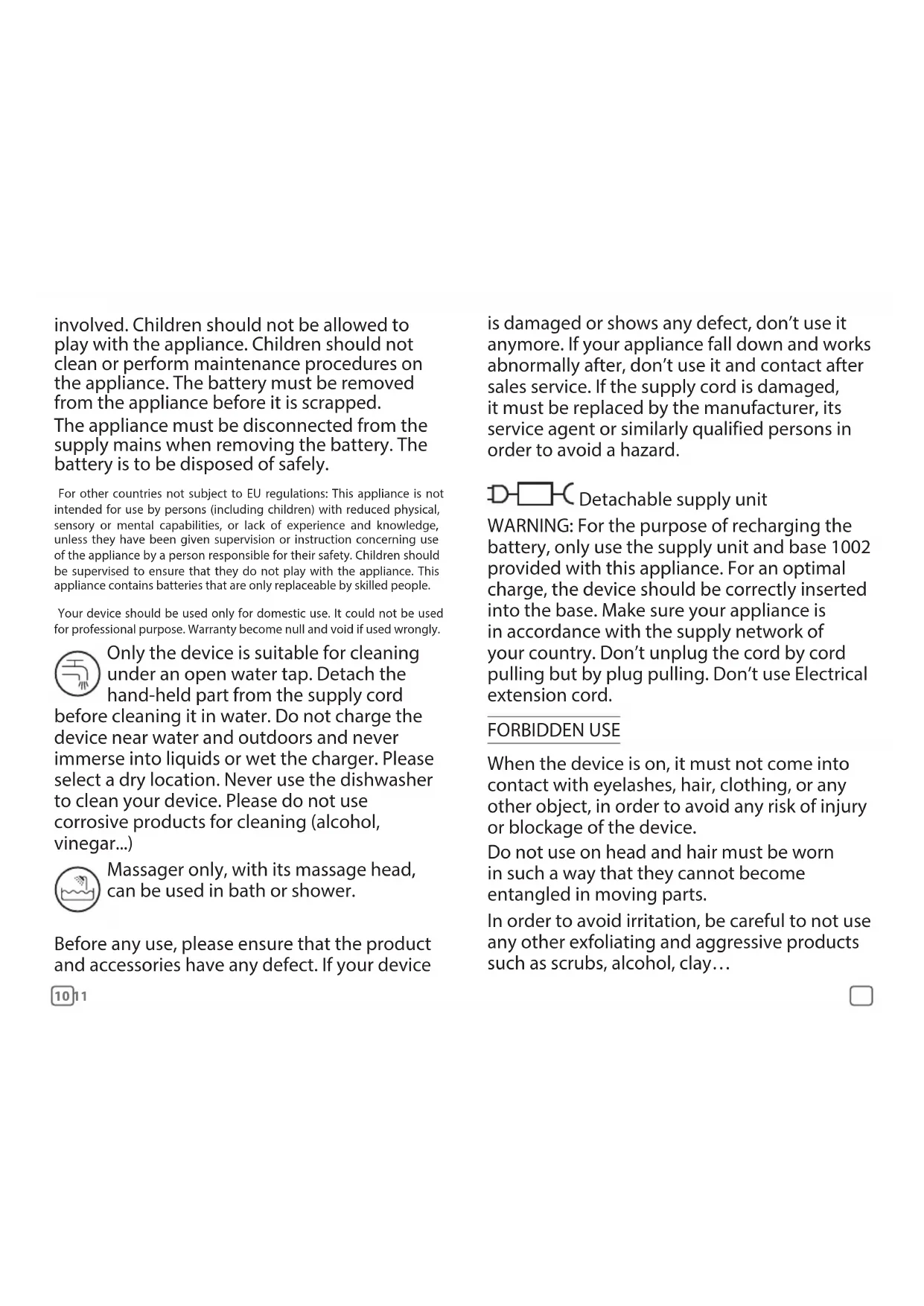 involved. Children should not be allowed to play with the appliance. Children should not clean or perform maintenance procedures on the appliance. The battery must be removed from the appliance before it is scrapped. The appliance must be disconnected from the supply mains when removing the battery. The battery is to be disposed of safely. For other countries not subject to EU regulations: This appliance is not intended for use by persons (including children) with reduced physical, sensory or mental capabilities, or lack of experience and knowledge, unless they have been given supervision or instruction concerning use of the appliance by a person responsible for their safety. Children should be supervised to ensure that they do not play with the appliance. This appliance contains batteries that are only replaceable by skilled people. Your device should be used only for domestic use. It could not be used for professional purpose. Warranty become null and void if used wrongly. Only the device is suitable for cleaning under an open water tap. Detach the hand-held part from the supply cord before cleaning it in water. Do not charge the device near water and outdoors and never immerse into liquids or wet the charger. Please select a dry location. Never use the dishwasher to clean your device. Please do not use corrosive products for cleaning (alcohol, vinegar...) Massager only, with its massage head, can be used in bath or shower. Before any use, please ensure that the product and accessories have any defect. If your device is damaged or shows any defect, don’t use it anymore. If your appliance fall down and works abnormally after, don’t use it and contact after sales service. If the supply cord is damaged, it must be replaced by the manufacturer, its service agent or similarly qualified persons in order to avoid a hazard. FORBIDDEN USE Detachable supply unit