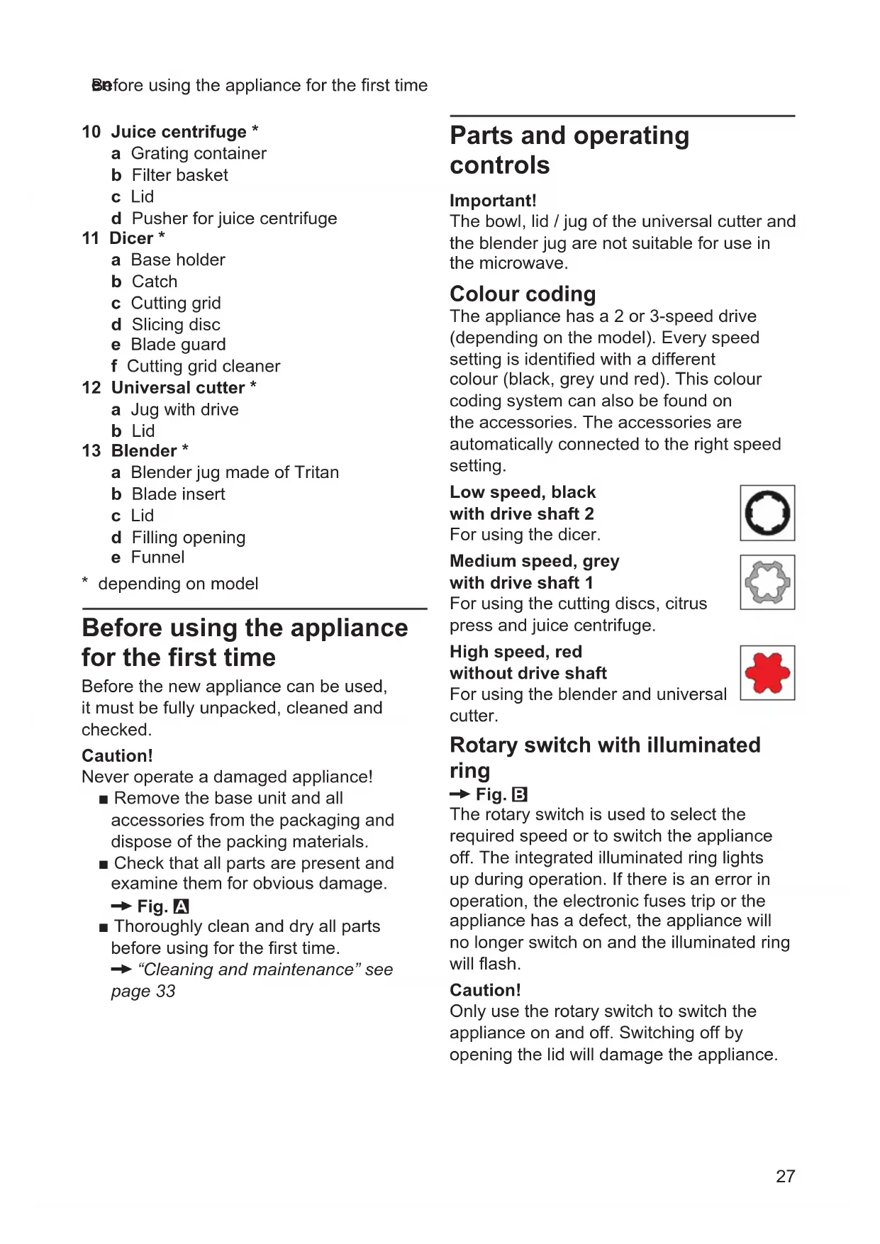 - depending on model Before using the appliance for the first time Before the new appliance can be used, it must be fully unpacked, cleaned and checked. Caution! Never operate a damaged appliance! ■ Remove the base unit and all accessories from the packaging and dispose of the packing materials. ■ Check that all parts are present and examine them for obvious damage. X Fig. A ■ Thoroughly clean and dry all parts before using for the first time. X “Cleaning and maintenance” see page 33 Parts and operating controls Important! The bowl, lid / jug of the universal cutter and the blender jug are not suitable for use in the microwave. Colour coding The appliance has a 2 or 3-speed drive (depending on the model). Every speed setting is identified with a different colour (black, grey und red). This colour coding system can also be found on the accessories. The accessories are automatically connected to the right speed setting. Low speed, black with drive shaft 2 For using the dicer. Medium speed, grey with drive shaft 1 For using the cutting discs, citrus press and juice centrifuge. High speed, red without drive shaft For using the blender and universal cutter. Rotary switch with illuminated ring X Fig. B The rotary switch is used to select the required speed or to switch the appliance off. The integrated illuminated ring lights up during operation. If there is an error in operation, the electronic fuses trip or the appliance has a defect, the appliance will no longer switch on and the illuminated ring will flash. Caution! Only use the rotary switch to switch the appliance on and off. Switching off by opening the lid will damage the appliance.28 en Preparation Settings
