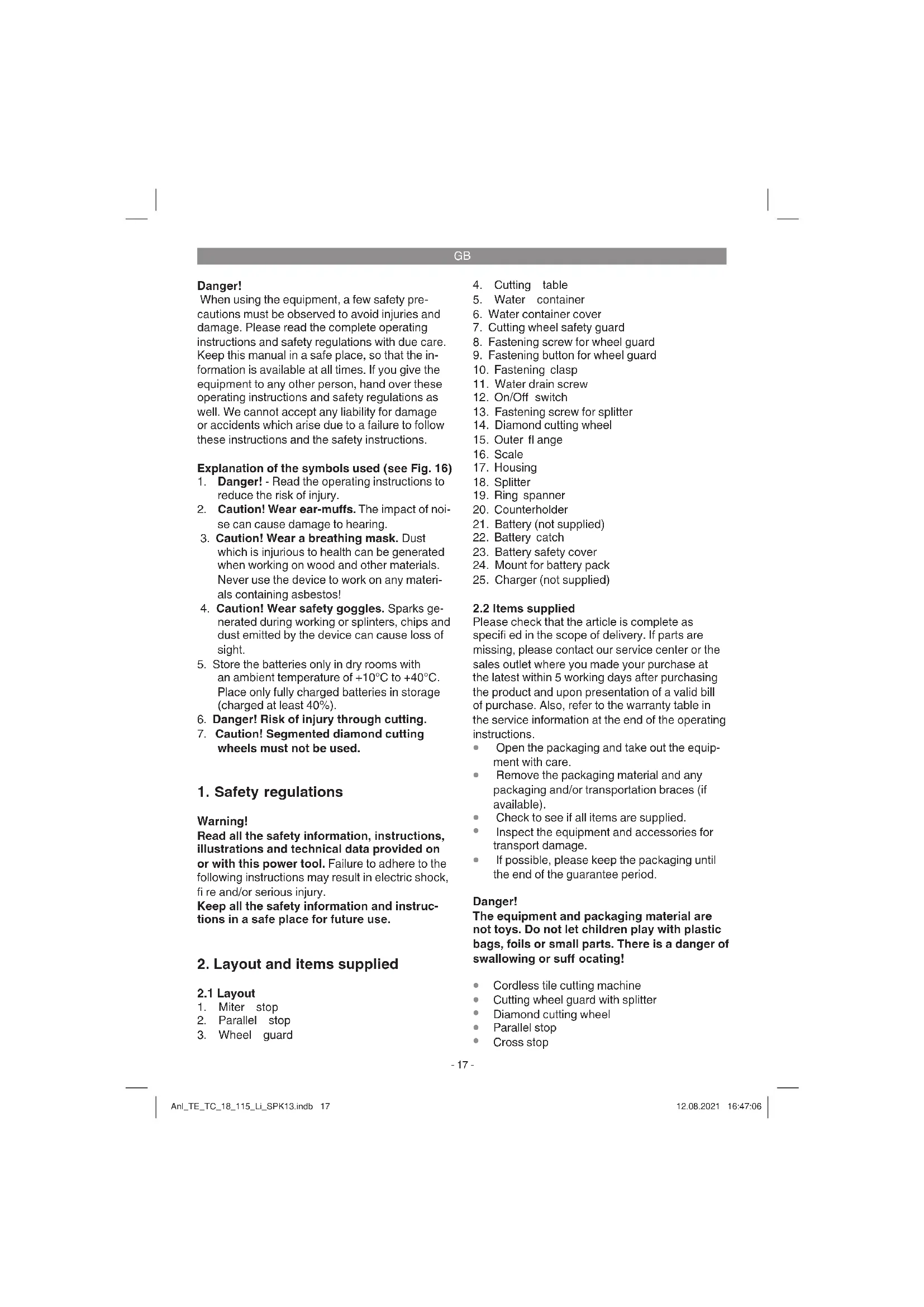 Please read the operating instructions carefully and observe the information provided. It is im- portant to consult these instructions in order to acquaint yourself with the equipment, its proper use and safety regulations. Danger! For safety reasons, the tile cutting machine is not to be used by children, young people under 16 years of age, or any other persons who are not Anl_TE_TC_18_115_Li_SPK13.indb 18Anl_TE_TC_18_115_Li_SPK13.indb 18 12.08.2021 16:47:0612.08.2021 16:47:06GB