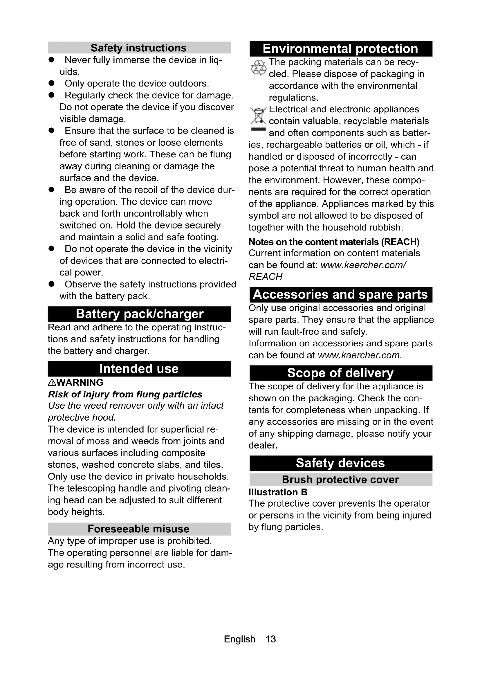 - EU Declaration of Conformity English 13 Safety instructions Never fully immerse the device in liq- uids. Only operate the device outdoors. Regularly check the device for damage. Do not operate the device if you discover visible damage. Ensure that the surface to be cleaned is free of sand, stones or loose elements before starting work. These can be flung away during cleaning or damage the surface and the device. Be aware of the recoil of the device dur- ing operation. The device can move back and forth uncontrollably when switched on. Hold the device securely and maintain a solid and safe footing. Do not operate the device in the vicinity of devices that are connected to electri- cal power. Observe the safety instructions provided with the battery pack. Battery pack/charger Read and adhere to the operating instruc- tions and safety instructions for handling the battery and charger. Intended use 몇 WARNING Risk of injury from flung particles Use the weed remover only with an intact protective hood. The device is intended for superficial re- moval of moss and weeds from joints and various surfaces including composite stones, washed concrete slabs, and tiles. Only use the device in private households. The telescoping handle and pivoting clean- ing head can be adjusted to suit different body heights. Foreseeable misuse Any type of improper use is prohibited. The operating personnel are liable for dam- age resulting from incorrect use. Environmental protection The packing materials can be recy- cled. Please dispose of packaging in accordance with the environmental regulations. Electrical and electronic appliances contain valuable, recyclable materials and often components such as batter- ies, rechargeable batteries or oil, which - if handled or disposed of incorrectly - can pose a potential threat to human health and the environment. However, these compo- nents are required for the correct operation of the appliance. Appliances marked by this symbol are not allowed to be disposed of together with the household rubbish. Notes on the content materials (REACH) Current information on content materials can be found at: www.kaercher.com/ REACH Accessories and spare parts Only use original accessories and original spare parts. They ensure that the appliance will run fault-free and safely. Information on accessories and spare parts can be found at www.kaercher.com. Scope of delivery The scope of delivery for the appliance is shown on the packaging. Check the con- tents for completeness when unpacking. If any accessories are missing or in the event of any shipping damage, please notify your dealer. Safety devices Brush protective cover Illustration B The protective cover prevents the operator or persons in the vicinity from being injured by flung particles.14 English Symbols on the device Description of the device See graphics page for illustrations Illustration A 1 Rotating nylon brush 2 Pivoting cleaning head 3 Pivoting cleaning head unlocking button 4 Telescoping handle 5 Second handle 6 Telescoping handle unlocking button 7 Trigger lockout button 8 Handle 9 Trigger 10 Mount for 18 V Battery Power battery pack 11 Battery pack unlocking button 12 Type plate 13 Brush protective cover 14 Guide aid with bristle strip locking cover Assembly p. 18