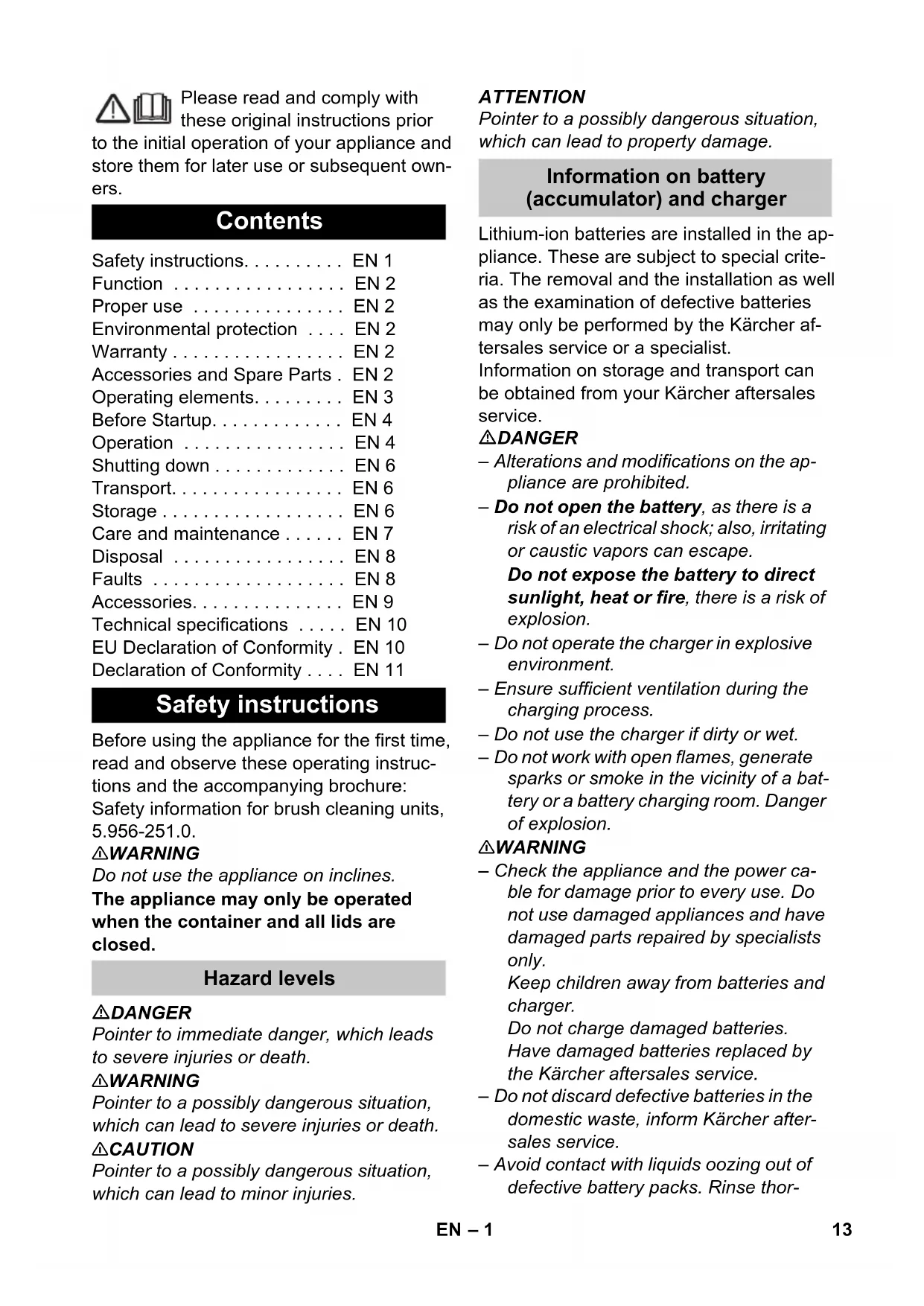 dB(A) 84 EU-Konformitätserklärung Produkt: Scheuersaugmaschine Typ: 1.783-xxx Einschlägige EU-Richtlinien 2006/42/EG (+2009/127/EG) 2014/30/EU 2011/65/EU 2014/53/EU (TCU) Angewandte harmonisierte Normen EN 60335–1 EN 60335–2–72 EN 60335-2-29 EN 55012: 2007 + A1: 2009 EN 55014-1:2006 + A1: 2009 + A2:2011 EN 55014–2: 1997 + A1: 2001 + A2: 2008 EN 61000–3–2: 2014 EN 61000–3–3: 2013 EN 61000–6–2: 2005 EN 62233: 2008 EN IEC 63000: 2018 Angewandte nationale Normen TCU EN 301 511 V12.5.1 EN 300 440 V2.1.1 EN 300 328 V2.2.2 EN 300 330 V2.1.1 Chairman of the Board of Management Director Regulatory Affairs & Certification 12 DE– 1 Please read and comply with these original instructions prior to the initial operation of your appliance and store them for later use or subsequent own- ers. Before using the appliance for the first time, read and observe these operating instruc- tions and the accompanying brochure: Safety information for brush cleaning units, 5.956-251.0. 몇 WARNING Do not use the appliance on inclines. The appliance may only be operated when the container and all lids are closed. DANGER Pointer to immediate danger, which leads to severe injuries or death. 몇 WARNING Pointer to a possibly dangerous situation, which can lead to severe injuries or death. 몇 CAUTION Pointer to a possibly dangerous situation, which can lead to minor injuries. ATTENTION Pointer to a possibly dangerous situation, which can lead to property damage. Lithium-ion batteries are installed in the ap- pliance. These are subject to special crite- ria. The removal and the installation as well as the examination of defective batteries may only be performed by the Kärcher af- tersales service or a specialist. Information on storage and transport can be obtained from your Kärcher aftersales service. DANGER – Alterations and modifications on the ap- pliance are prohibited. – Do not open the battery, as there is a risk of an electrical shock; also, irritating or caustic vapors can escape. Do not expose the battery to direct sunlight, heat or fire, there is a risk of explosion. – Do not operate the charger in explosive environment. – Ensure sufficient ventilation during the charging process. – Do not use the charger if dirty or wet. – Do not work with open flames, generate sparks or smoke in the vicinity of a bat- tery or a battery charging room. Danger of explosion. 몇 WARNING – Check the appliance and the power ca- ble for damage prior to every use. Do not use damaged appliances and have damaged parts repaired by specialists only. Keep children away from batteries and charger. Do not charge damaged batteries. Have damaged batteries replaced by the Kärcher aftersales service. – Do not discard defective batteries in the domestic waste, inform Kärcher after- sales service. – Avoid contact with liquids oozing out of defective battery packs. Rinse thor- Contents Safety instructions... EN 1 Function ... EN 2 Proper use ... EN 2 Environmental protection ... EN 2 Warranty ... EN 2 Accessories and Spare Parts . EN 2 Operating elements... EN 3 Before Startup... EN 4 Operation ... EN 4 Shutting down ... EN 6 Transport... EN 6 Storage ... EN 6 Care and maintenance ... EN 7 Disposal ... EN 8 Faults ... EN 8 Accessories... EN 9 Technical specifications ... EN 10 EU Declaration of Conformity . EN 10 Declaration of Conformity ... EN 11 Safety instructions Hazard levels Information on battery (accumulator) and charger 13EN– 2 oughly if you accidentally come in con- tact with the fluid. Also consult a doctor if the fluid comes in contact with your eyes. 몇 CAUTION – These operating instructions must be observed unconditionally. Observe rec- ommendations of the lawmaker for han- dling batteries. – The mains voltage must correspond with the voltage indicated on the type plate of the appliance. – Use the charger only to charge ap- proved battery packs. – The accumulator may only be operated with this appliance. It is dangerous and prohibited to use it for other purposes. If the safety switch is released, the brush drive shuts off. The scrubbing vacuum cleaner is used for the wet cleaning of level floors. It can be easily adjusted to the cleaning task by setting the water quantity. A working width of 350 mm and a capacity of 12 l in the fresh and wastewater tank each enable effective cleaning with long action times. The battery can be charged on a 230V power outlet by means of the integrated charger. Use this appliance only as directed in these operating instructions. – This appliance is suited for the commer- cial use, e.g. in hotels, schools, hospi- tals, factories, shops, offices, and rental companies. – The appliance should only be used for cleaning level floors that are not affect- ed by moisture. – This appliance is intended for inside use. – The appliance is not suited for the cleaning of frozen grounds (e.g. in cold stores). – The appliance may only be equipped with original accessories and spare parts. The packaging material can be recy- cled. Please do not place the packag- ing into the ordinary refuse for disposal, but arrange for the proper recycling. Old appliances contain valuable ma- terials that can be recycled. Please arrange for the proper recycling of old appliances. Please dispose your old appli- ances using appropriate collection sys- tems. Information on ingredients (REACH) The latest information on ingredients can be found under: www.kaercher.de/REACH The warranty terms published by our com- petent sales company are applicable in each country. We will repair potential fail- ures of your accessory within the warranty period free of charge, provided that such failure is caused by faulty material or de- fects in fabrication. In the event of a warran- ty claim please contact your dealer or the nearest authorized Customer Service cent- er. Please submit the proof of purchase. Only use original accessories and spare parts, they ensure the safe and trouble-f